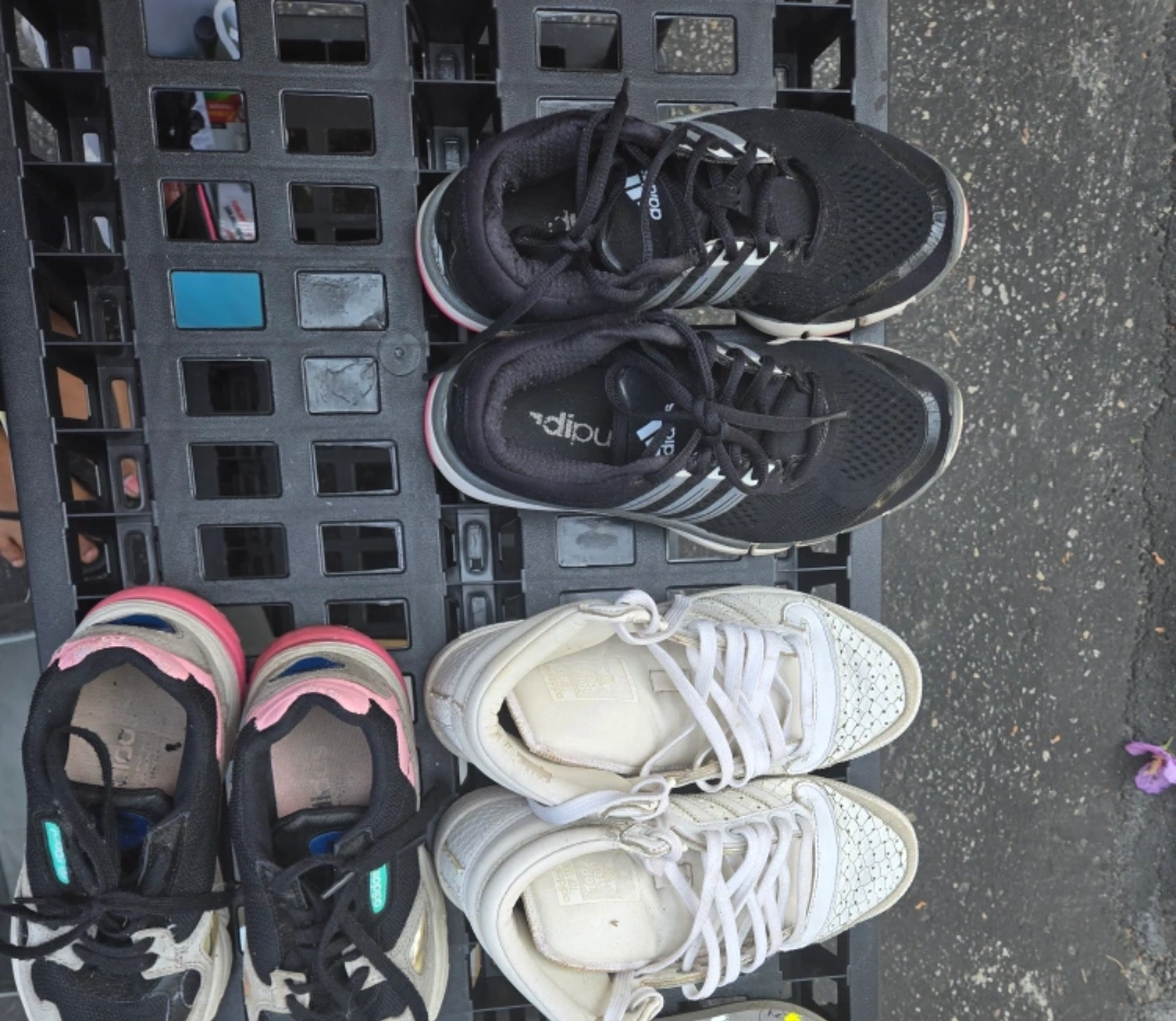 Selling a bundle of Adidas kids' shoes. Includes running shoes, sneakers, and flip flops. All in used condition.