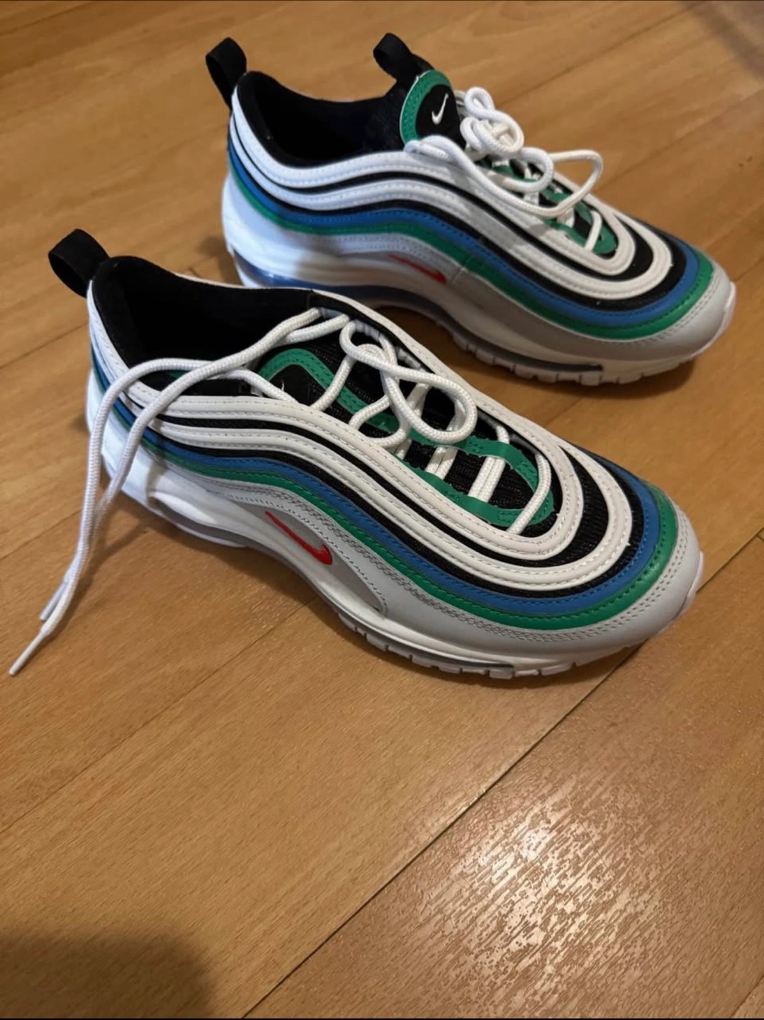 Selling a pair of BRAND NEW Nike Air Max 97 in size 5Y. They feature a cool design with white, black, blue, and green stripes. Check out the photos for the condition!