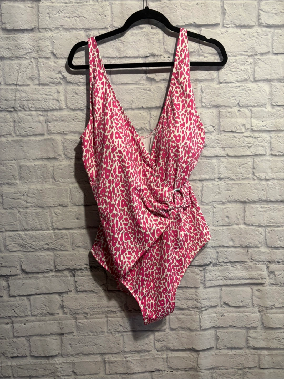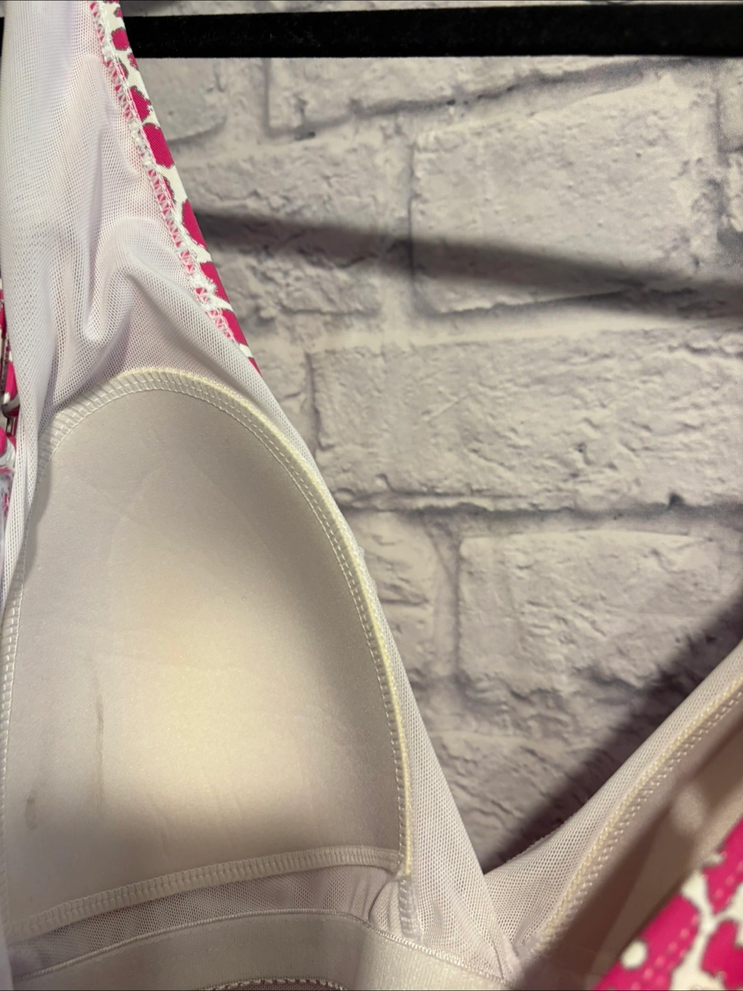 Selling a swimsuit in size 16. It's a pink and white colour with a fun pattern! The shell is made of 83% nylon and 17% spandex. The lining is 90% polyester and 10% spandex. New with tag.