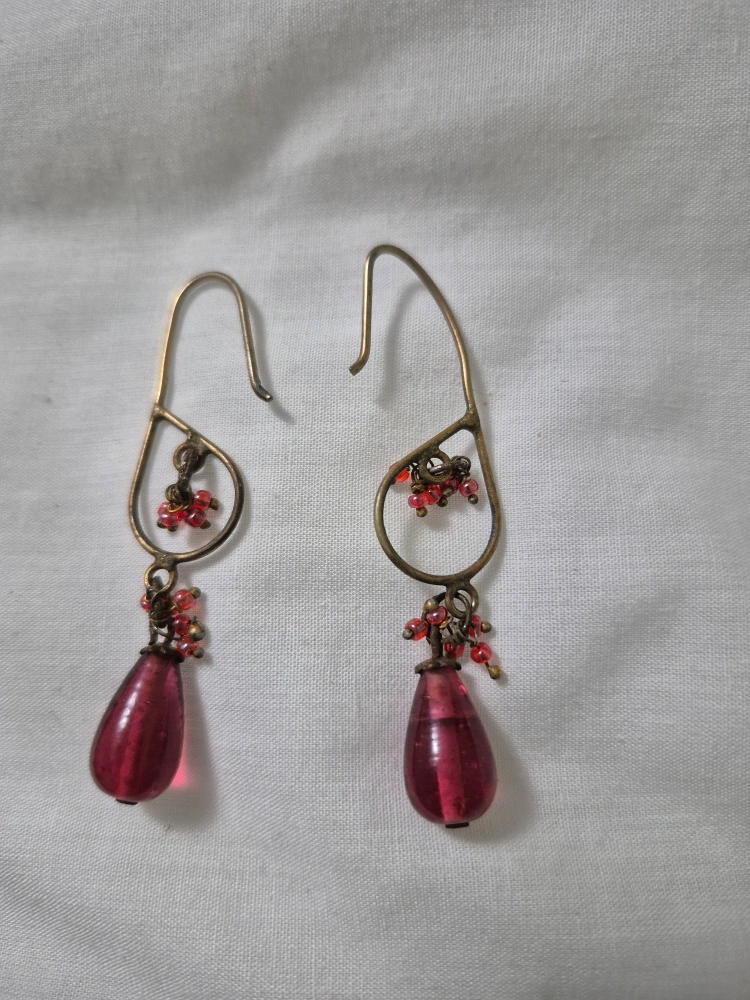 18These are a pair of drop earrings with a teardrop shaped red bead. They have a gold colored metal and red seed beads.