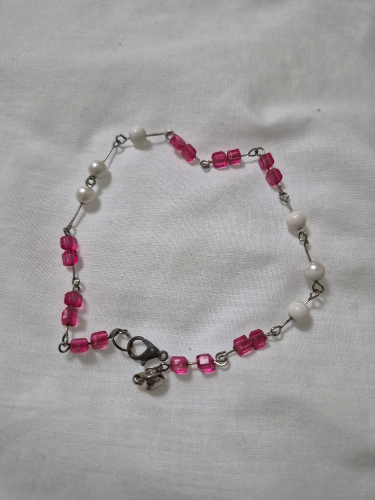 18Selling a cute beaded bracelet! It features a mix of pink cube-shaped beads and white round beads, strung together with silver-tone metal links. A simple and sweet accessory!