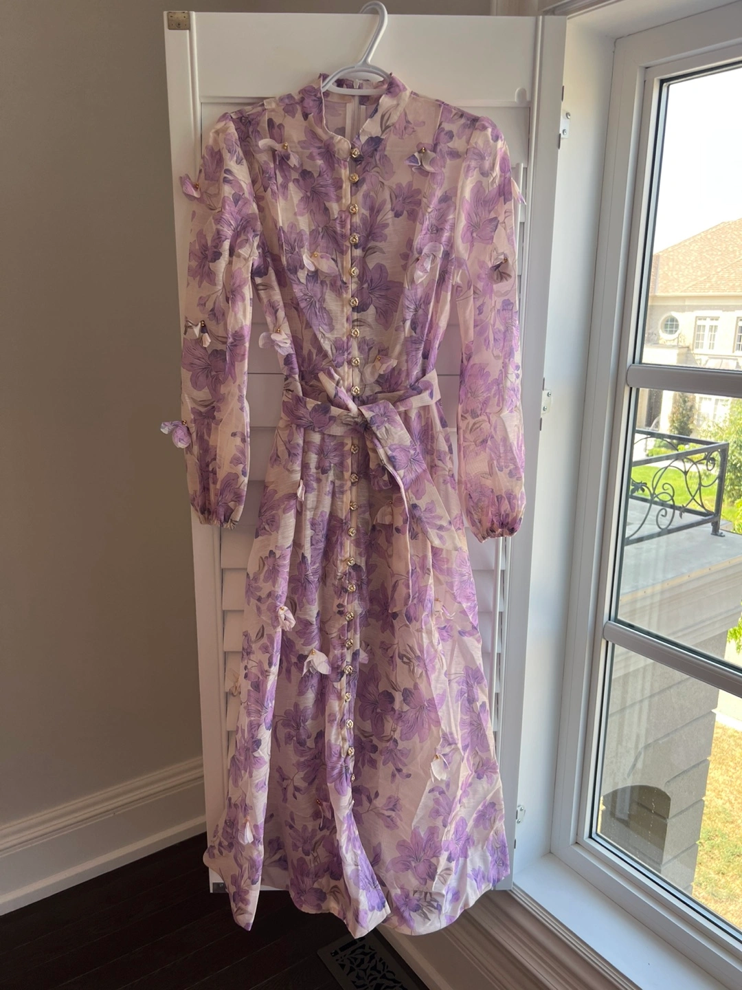 This is a lovely floral print dress in shades of purple and white. It features a button-down front, long sleeves, and a tie waist. Perfect for a special occasion or a stylish everyday look!