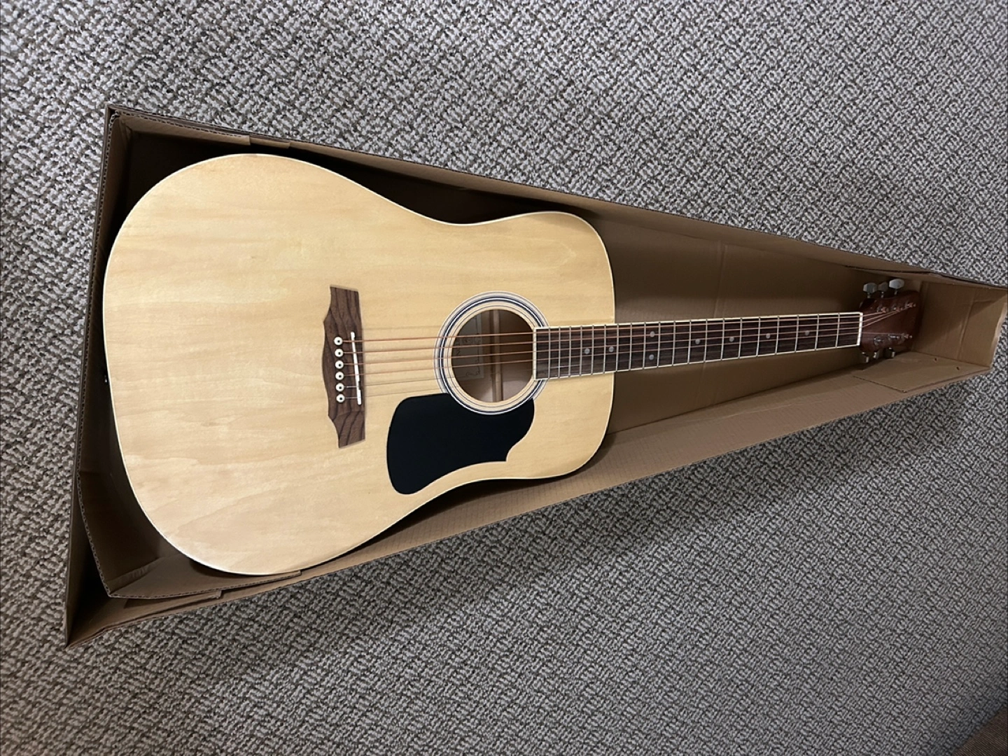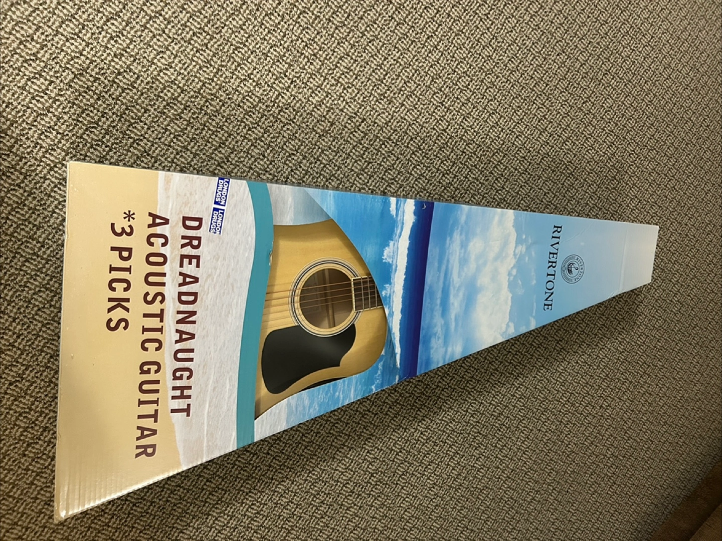 brand new Rivertone Dreadnought Acoustic Guitar! It's still in its original box. This guitar is perfect for beginners or anyone looking for a quality acoustic instrument. Get ready to strum some tunes!