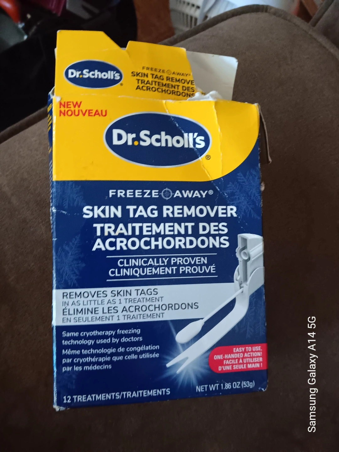 Selling a Dr. Scholl's Freeze Away Skin Tag Remover. It removes skin tags in as little as 1 treatment. It uses the same cryotherapy freezing technology used by doctors. Easy to use, one-handed action! Contains 12 treatments. New box a bit damaged 5 dollars 647-203-0411