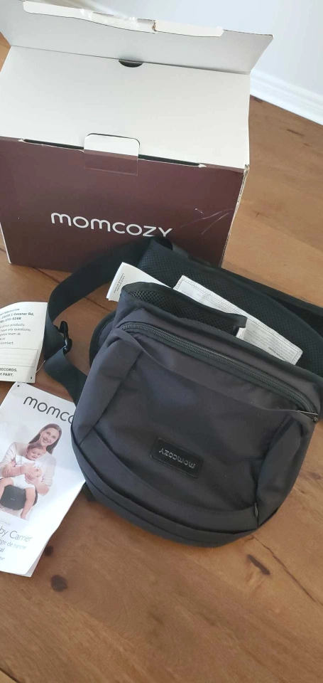 Selling a Momcozy hip seat baby carrier in black! It's designed with spacious pockets, making trips easier. The carrier supports 4 carrying positions: Hip Carry, Forward-Facing, and Cradle/Feeding.The box is included!