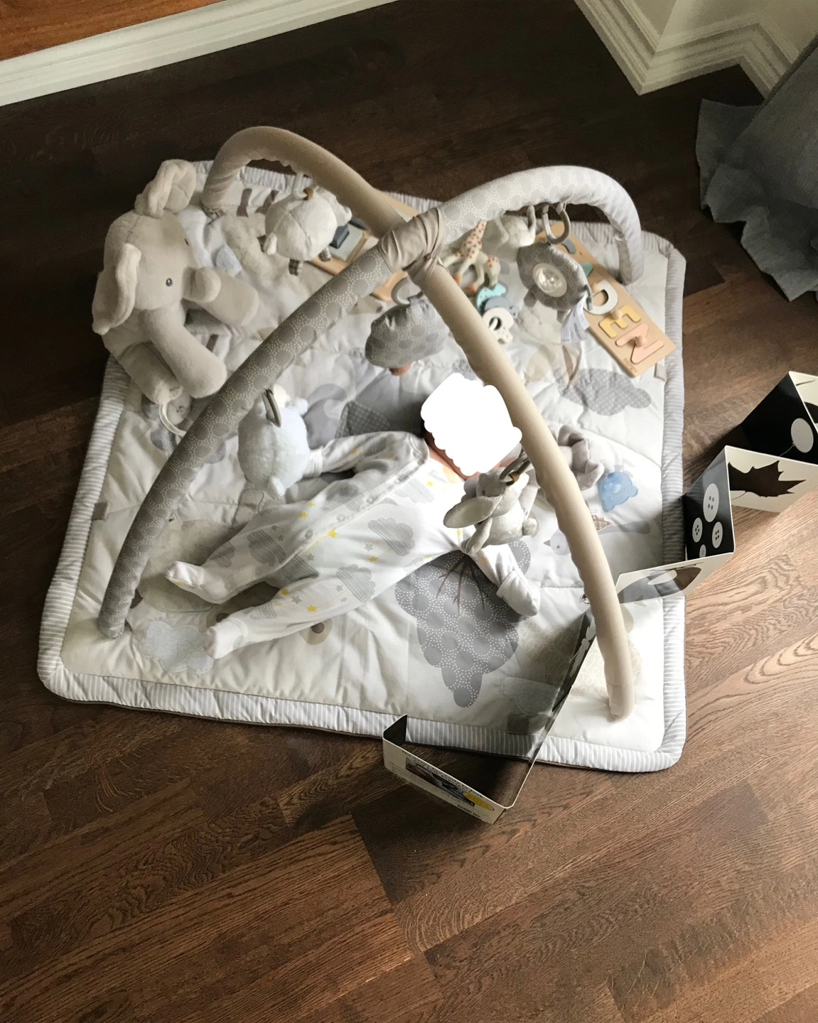Pottery Barn activity mat for babies. Currently washed and stored away. Comes with 5 hanging toys as shown.