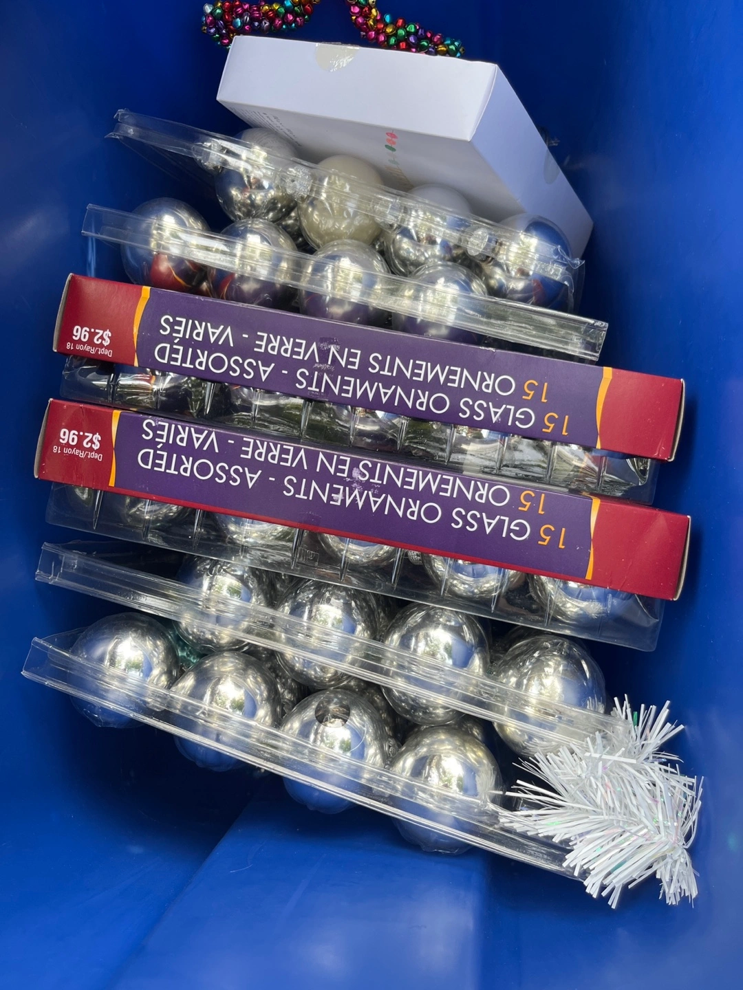 Selling assorted glass ball ornaments, perfect for adding a touch of sparkle to your holiday decorations. Most are silver.