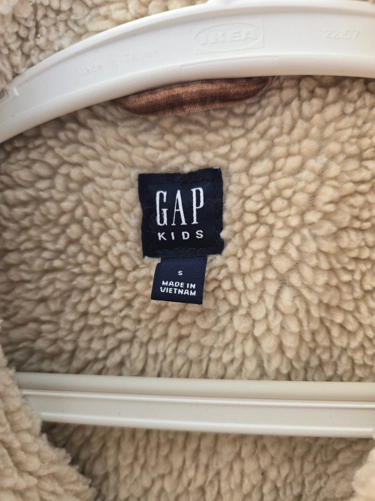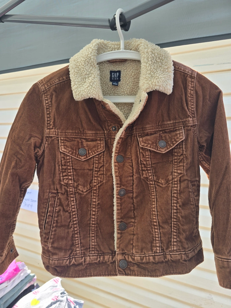 Here's a cute GAP Kids corduroy jacket with a sherpa collar! It's in great condition and perfect for keeping your little one warm and stylish. The jacket is a size S and features a classic design with a soft sherpa lining.