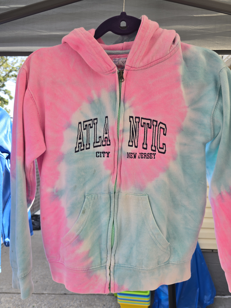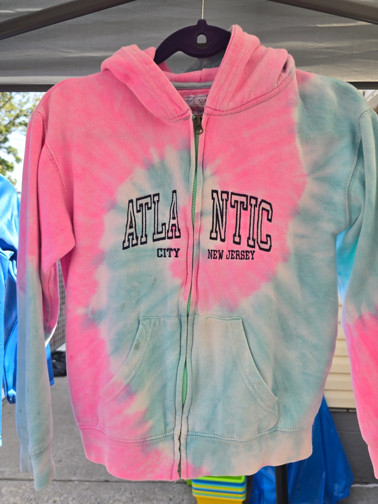 Cute tie dye hoodie from Exist! It's a size large and has a full zipper. The colors are a mix of pink, blue, and white. It says 'Atlantic City New Jersey' on the front