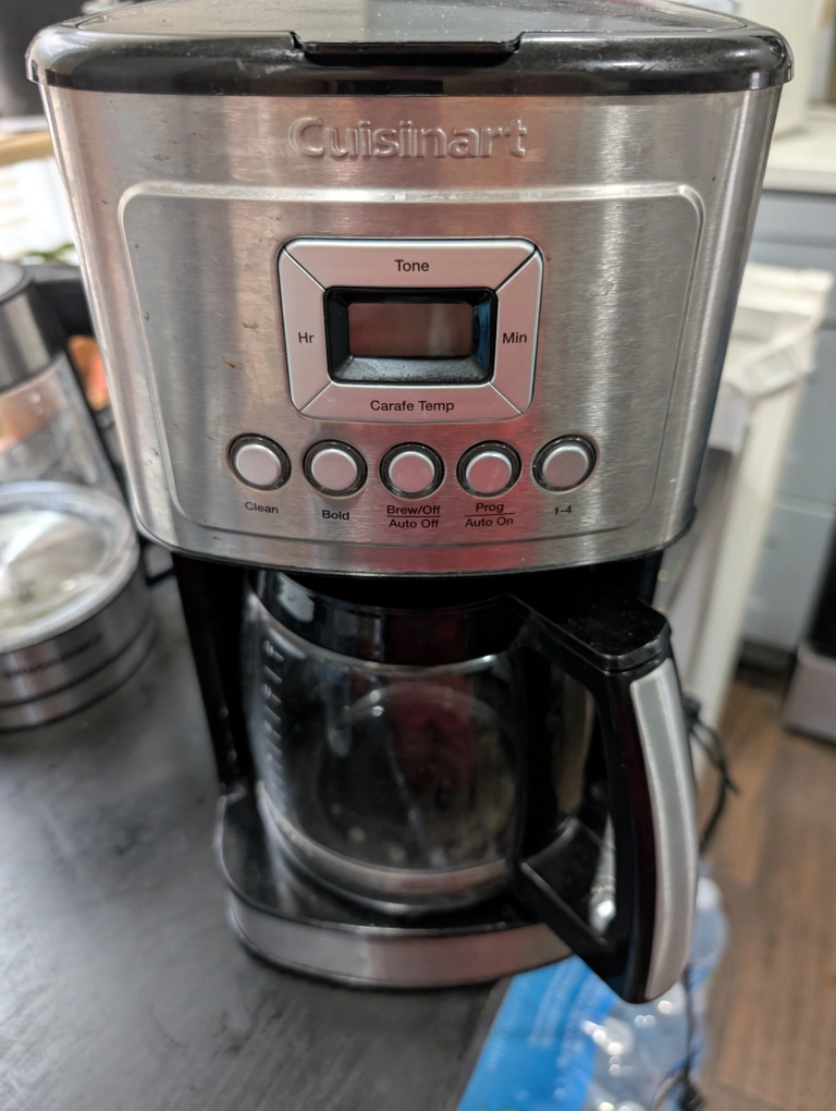 113Selling a Cuisinart coffee maker! It has buttons for clean, bold, brew/off auto off, and prog auto on. There's also a tone setting and carafe temp setting. Used but still in good condition.