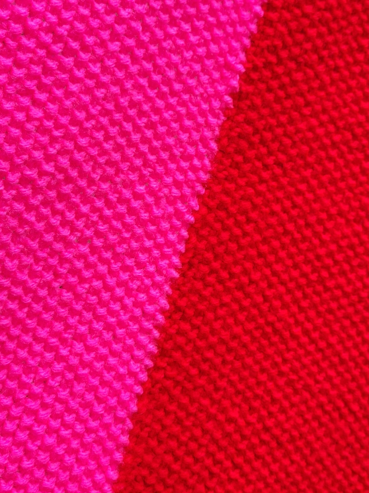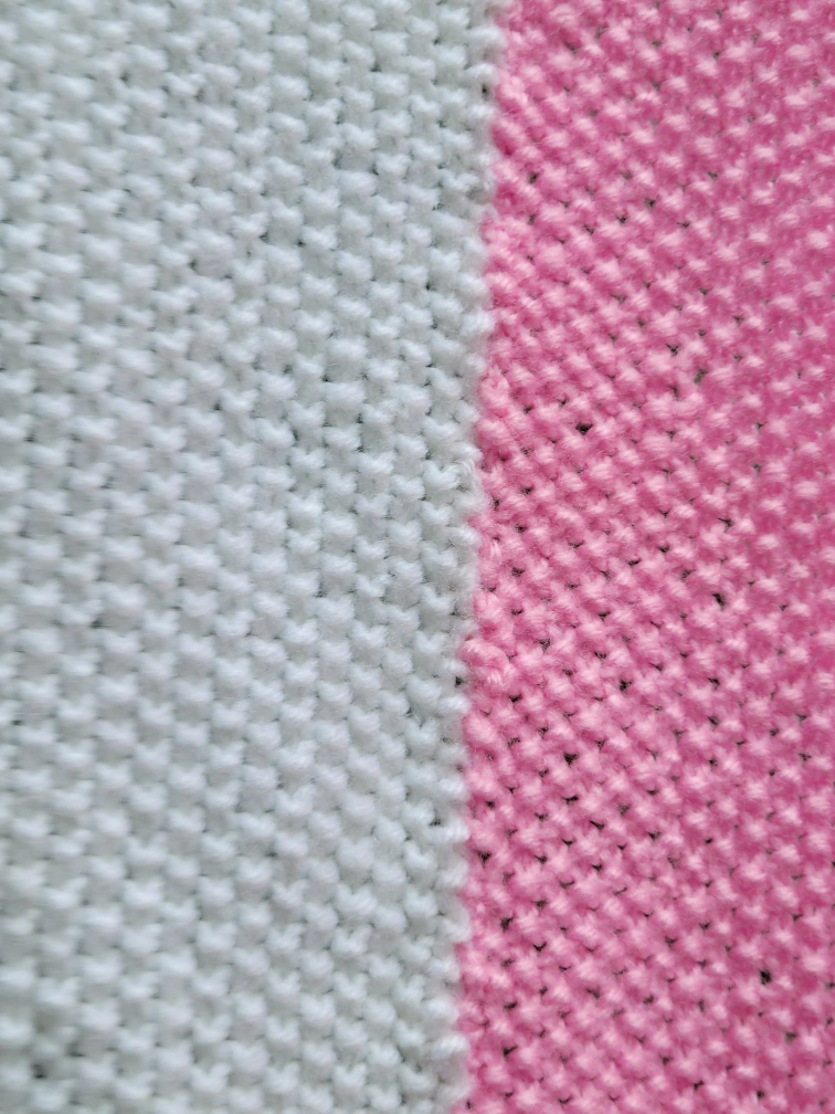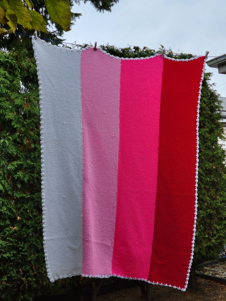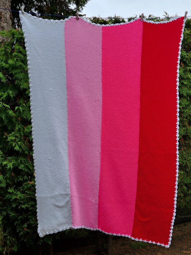 Knit blanket with white, pink, and red stripes. White border. 47" x 67" good condition $20 Firm Fennell and Upper gage Hamilton please see my many other ads