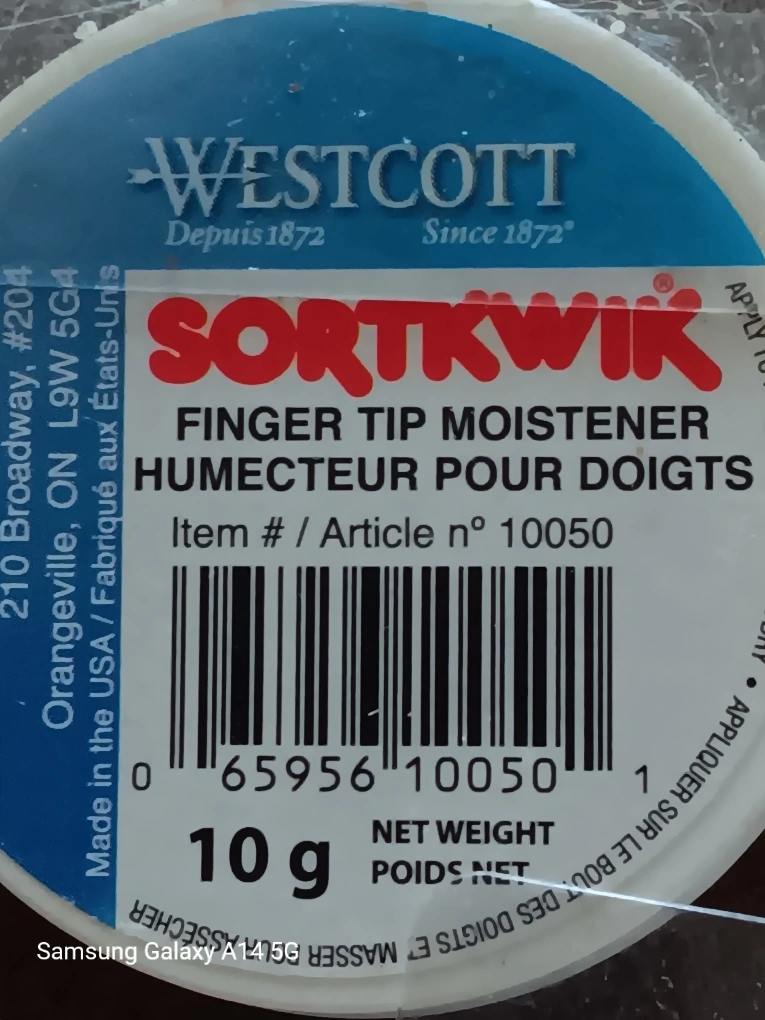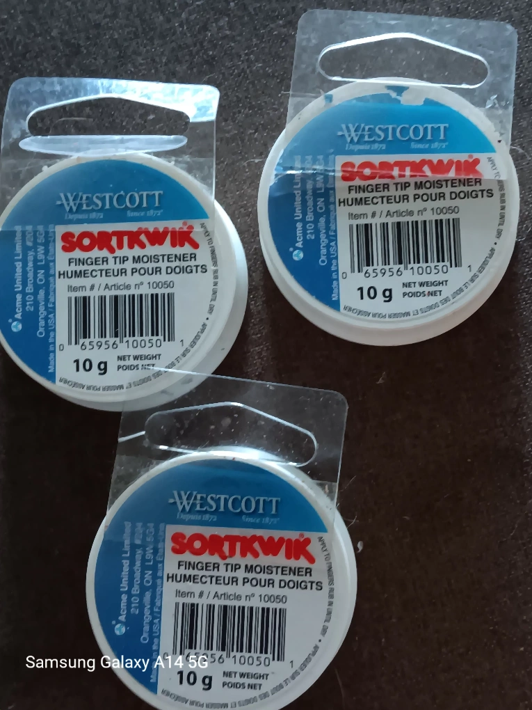 Selling a Westcott Sortkwik Finger Tip Moistener! It's perfect for anyone who needs a little extra grip when counting money, sorting papers, or any other task that requires fingertip precision. Each container has 10g . New never used all 3 for $ 5 647-203-0411