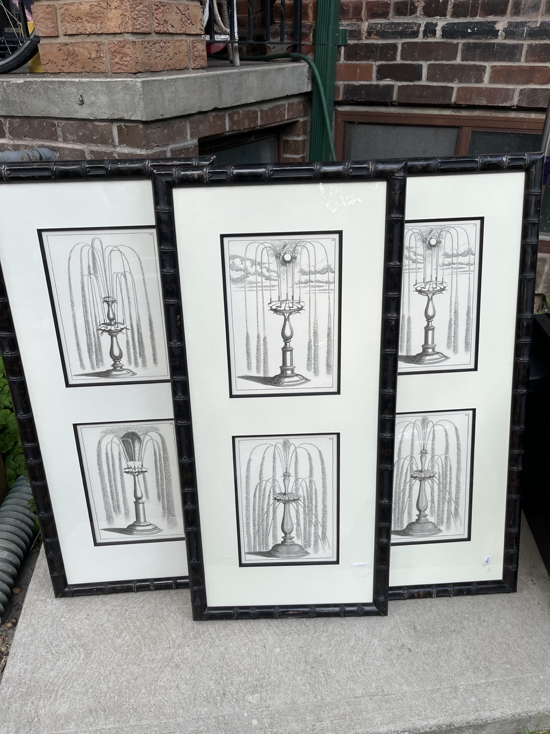 Selling a set of three framed art prints featuring fountain designs. They have a black frame and are in good condition. These would be a lovely addition to any room!
