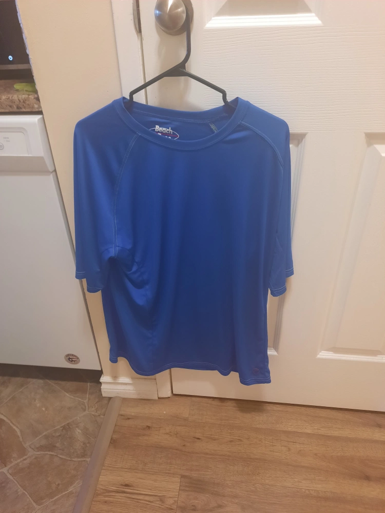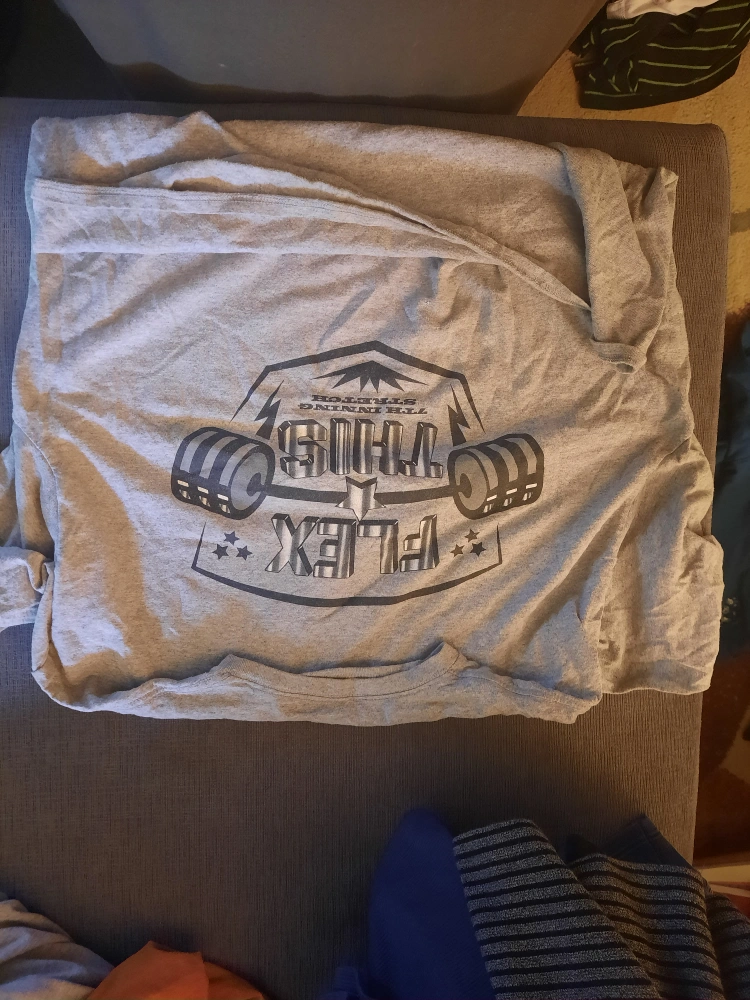 The shirt is designed with a crewneck and white stitching details on the seams. It is likely made from a quick-drying, moisture-wicking, and sun-protective fabric, such as polyester, suitable for activities like swimming or other sports. Similar shirts are often referred to as rash guards or swim shirts. $5.00 The image shows a gray t-shirt with a graphic design. The design features the word "FLEX" above a barbell with weights. $5.00