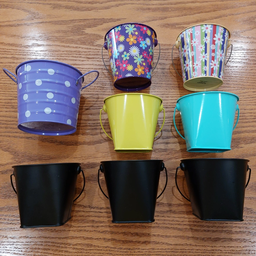 8 metal Pails. Perfect for crafts or gifts! 3 black are chalkboard pails Aqua, yellow and 3 black measure 3.75"H x 2.75"W 2 flower patterned pails measure 4"H x 3"W Polka dot pails measures 4.25"H x 4"W Pick up near Grandview/Beatrice in Oshawa