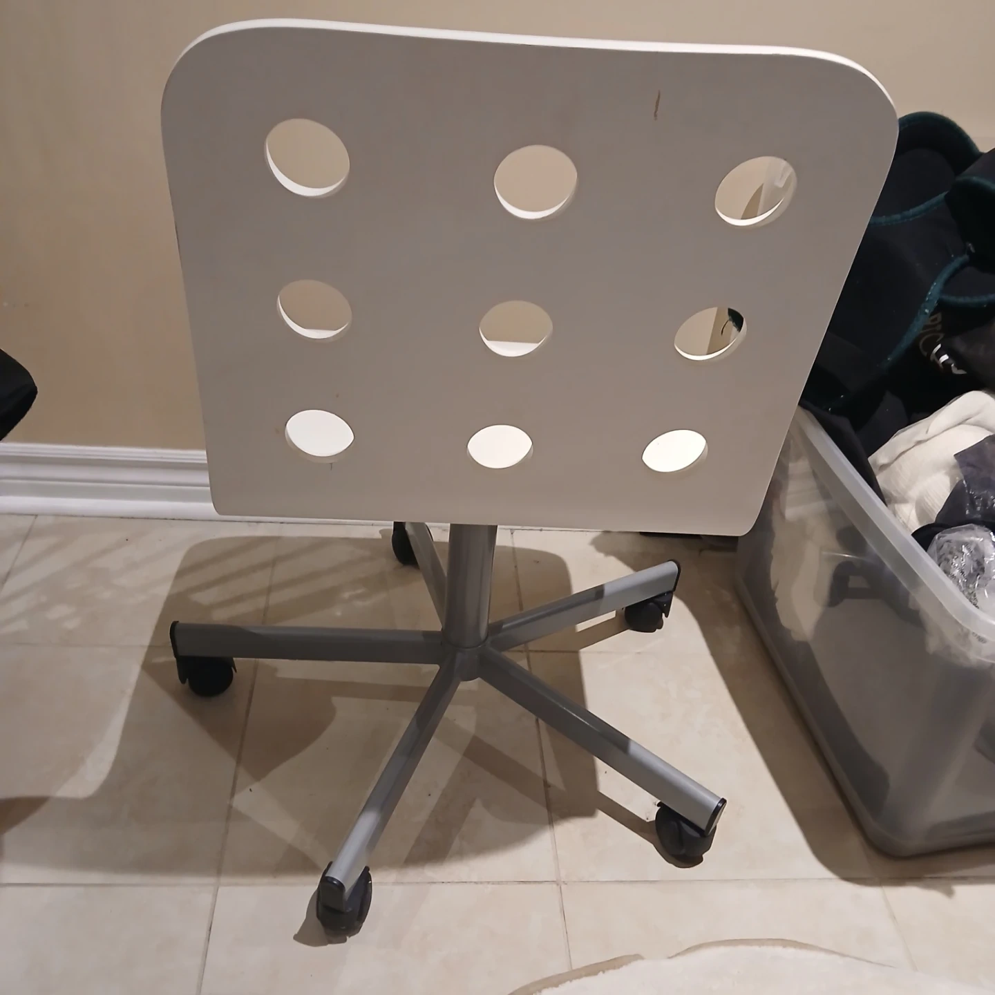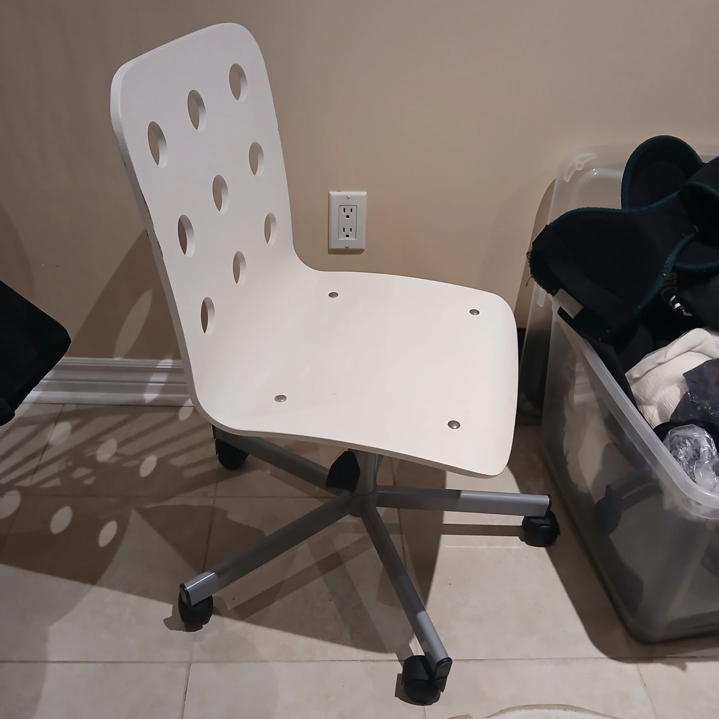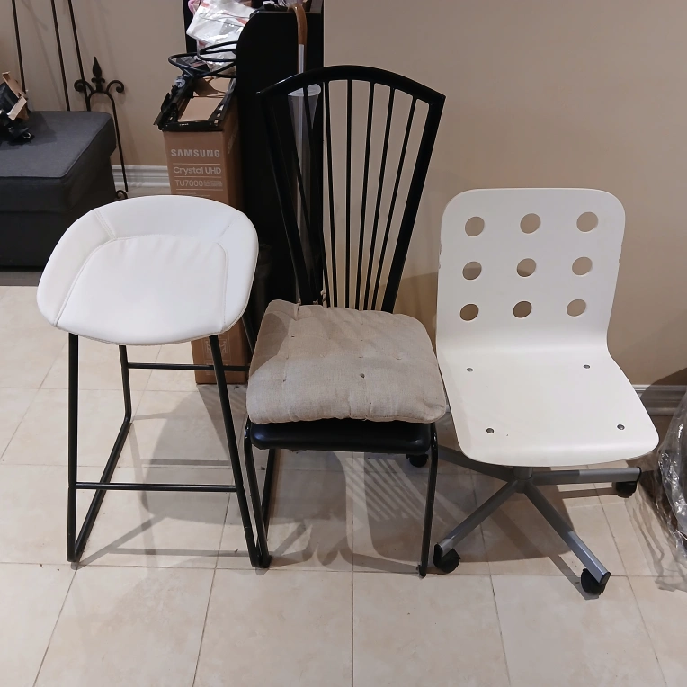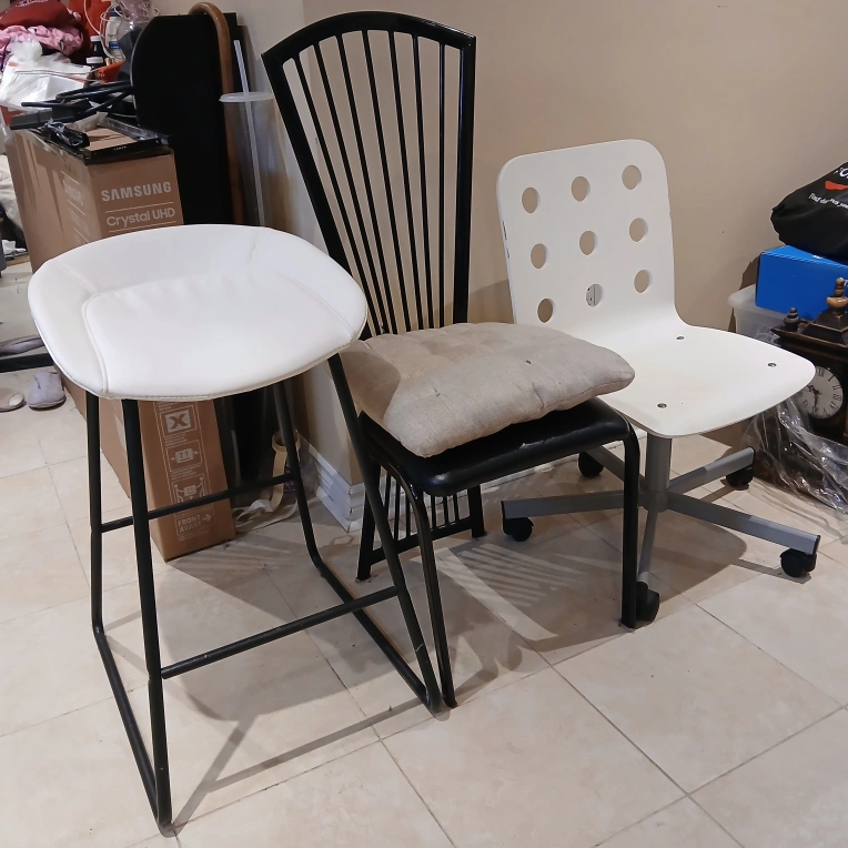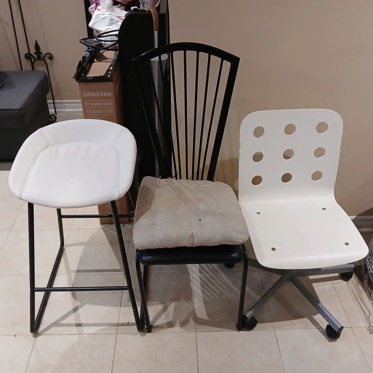 Selling a set of three various chairs. Very good condition. There's a white bar stool, a black spindle-back chair with a padded seat, and a white office chair with wheels. White Chair left side of picture $40.
