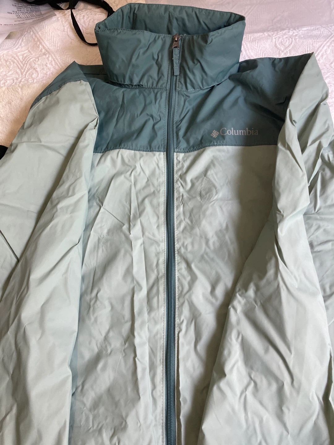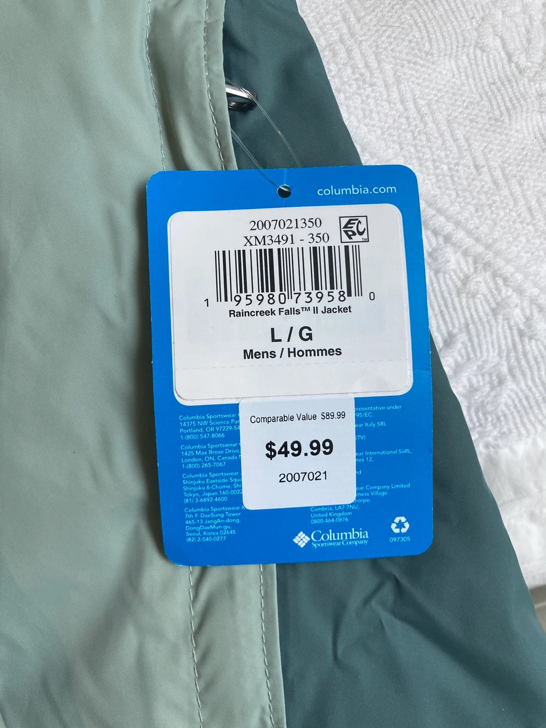 Selling a Columbia Raincreek Falls II Jacket in size L. The tag shows a comparable value of $89.99, but it's listed for $49.99. It's a great jacket for men!
