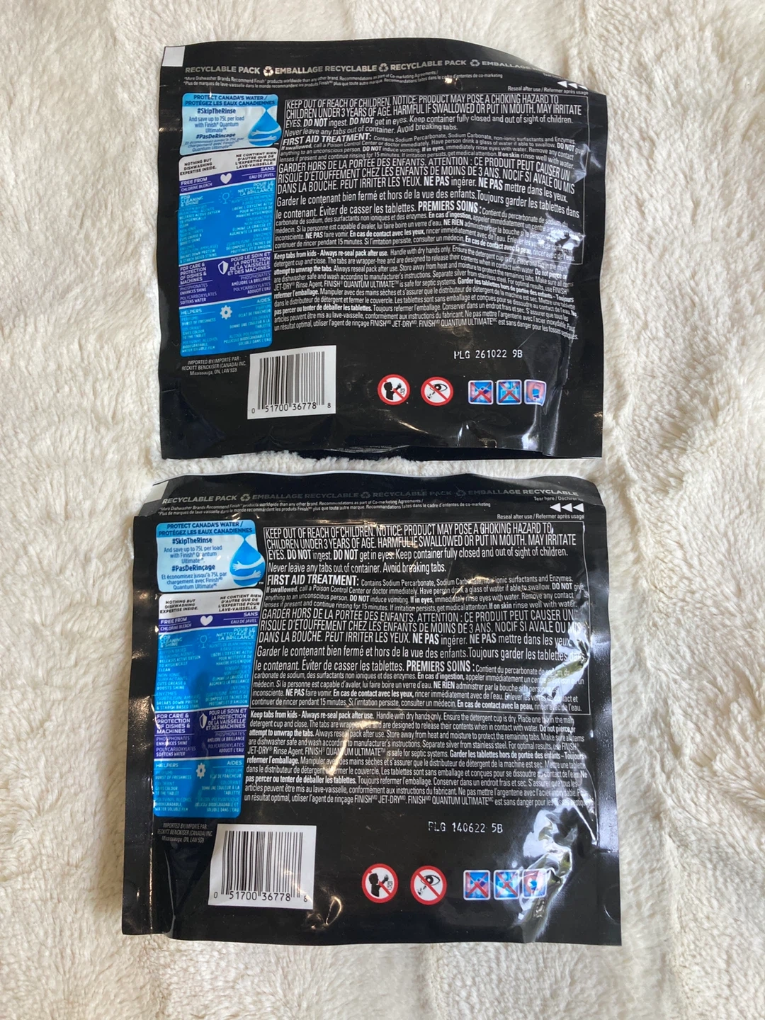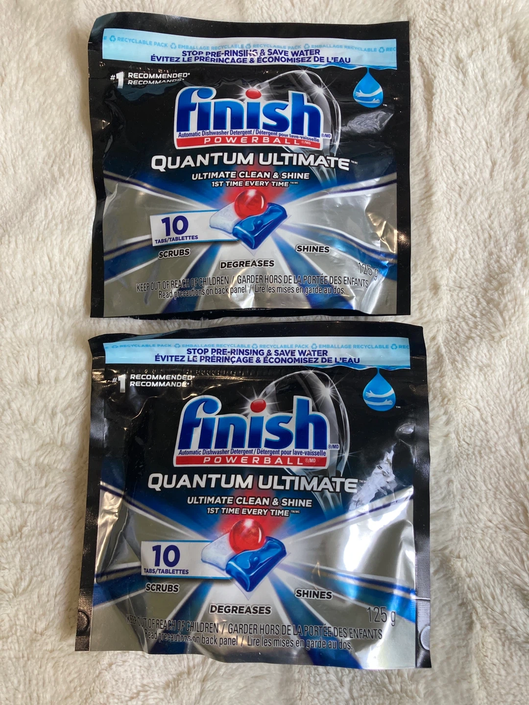 Selling two packs of Finish Quantum Ultimate dishwasher detergent Powerball tabs. Each pack contains 10 tabs, for a total of 20 tabs. These powerful tabs provide ultimate clean and shine every time! They scrub, degrease, and shine your dishes, leaving them sparkling clean