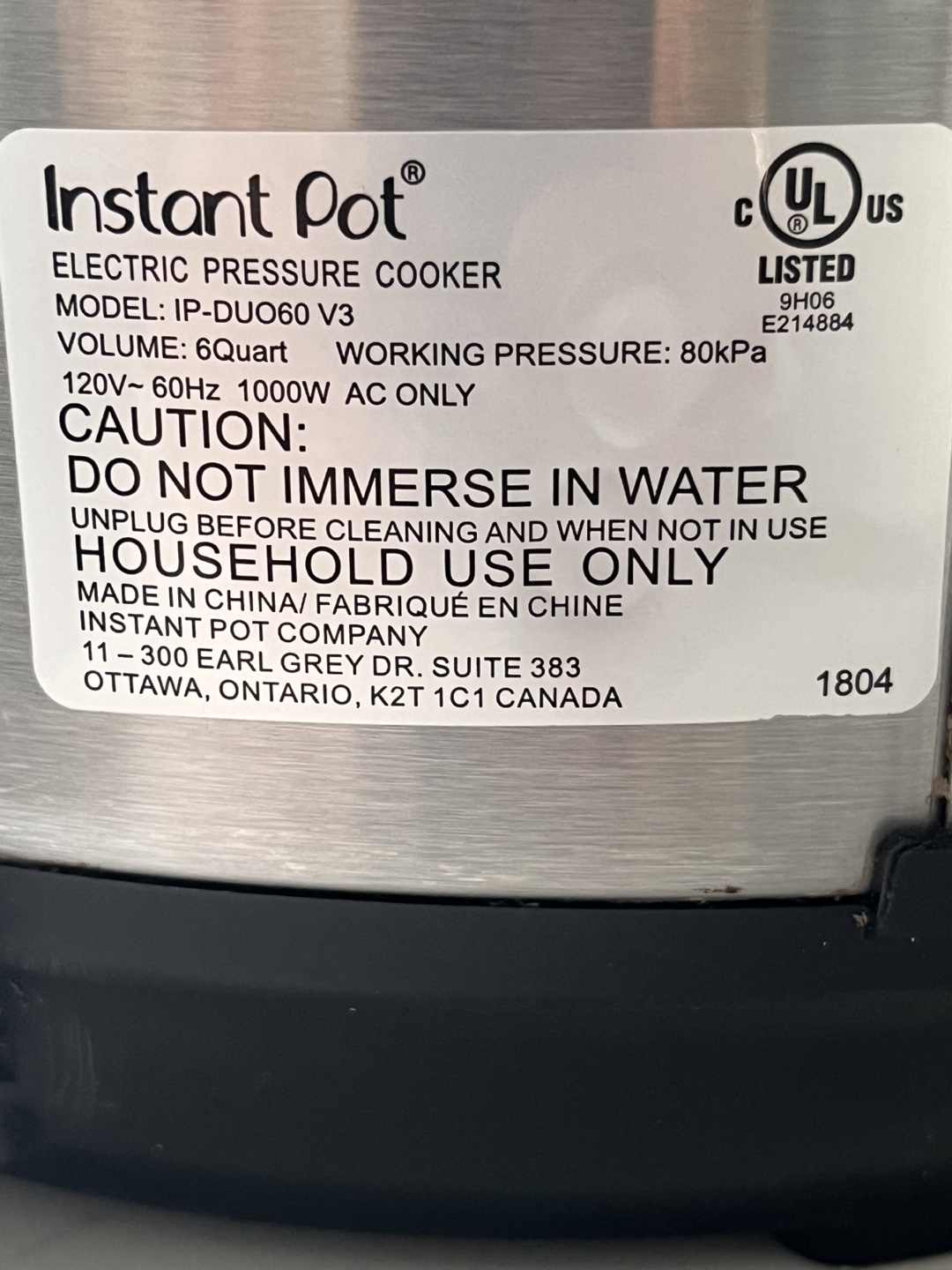 Selling an Instant Pot electric pressure cooker. It has a 6-quart volume and a working pressure of 80 kPa. Perfect for cooking a variety of meals!