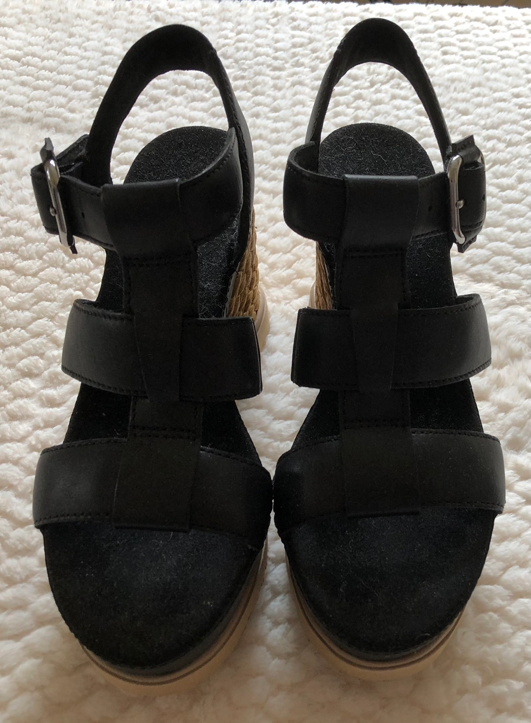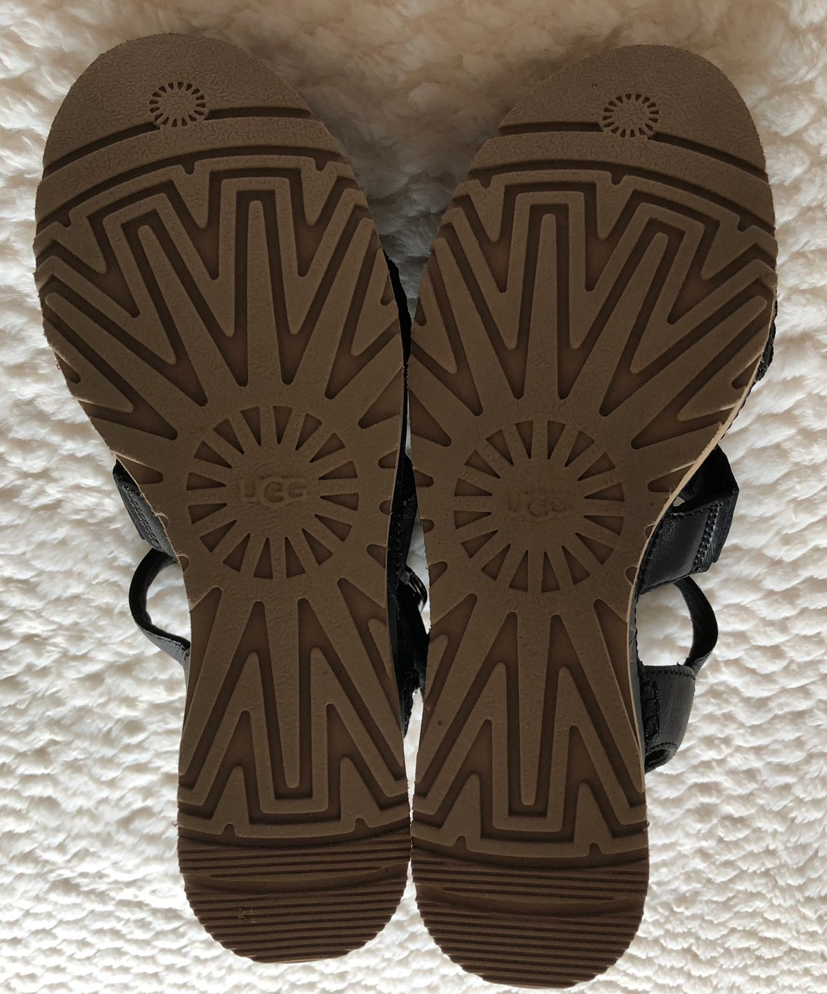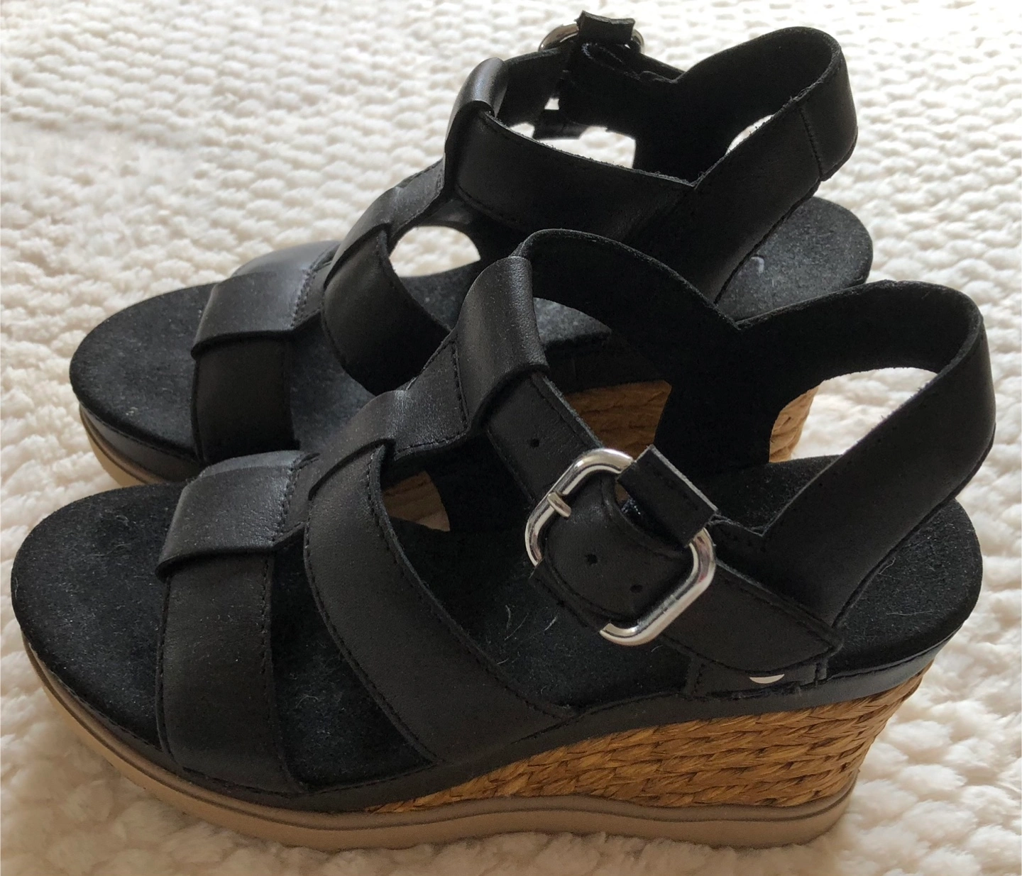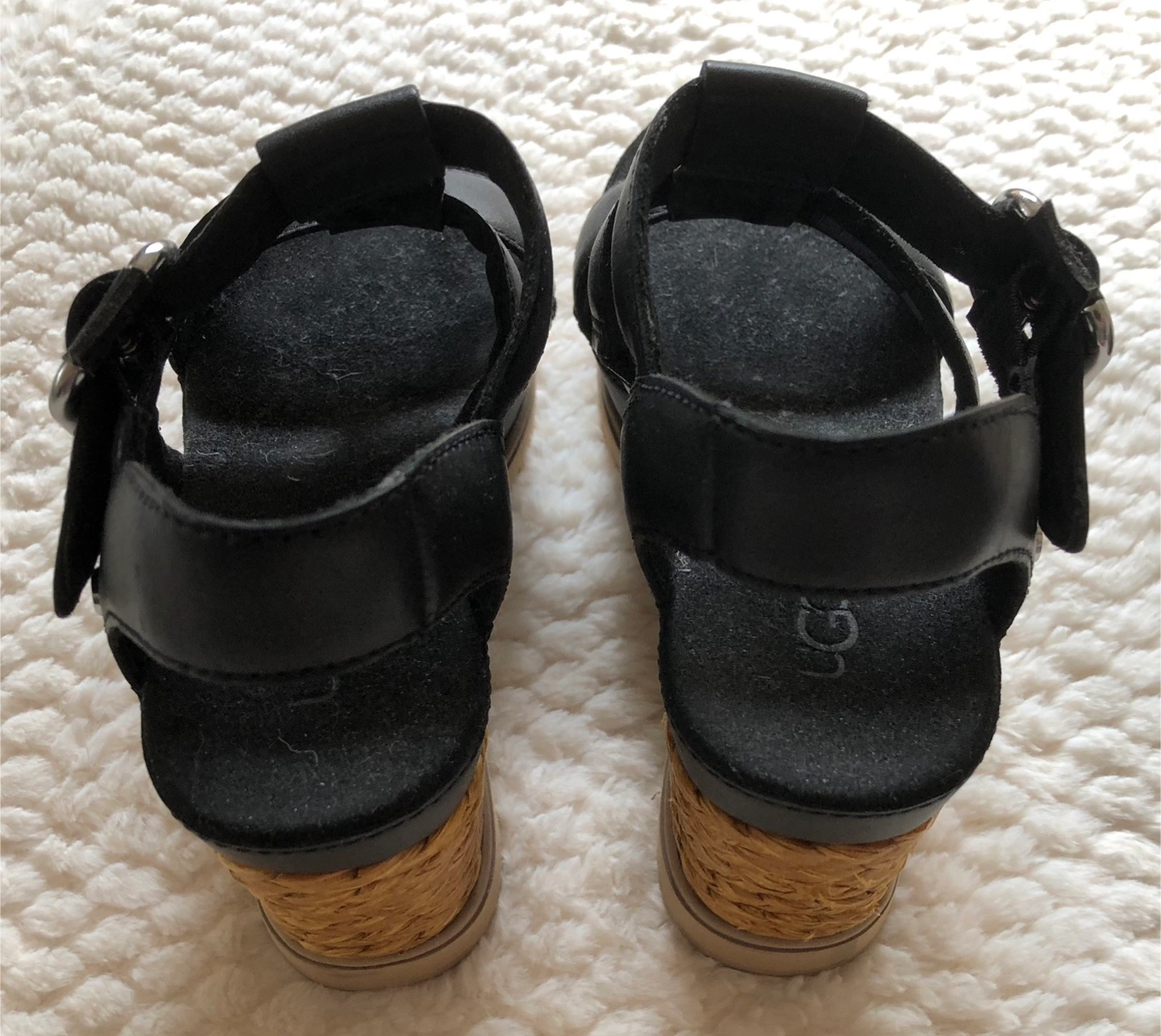 These UGG sandals are perfect for adding a bit of height and style to your summer outfits! They feature a black leather upper with a woven wedge heel. Size 7.