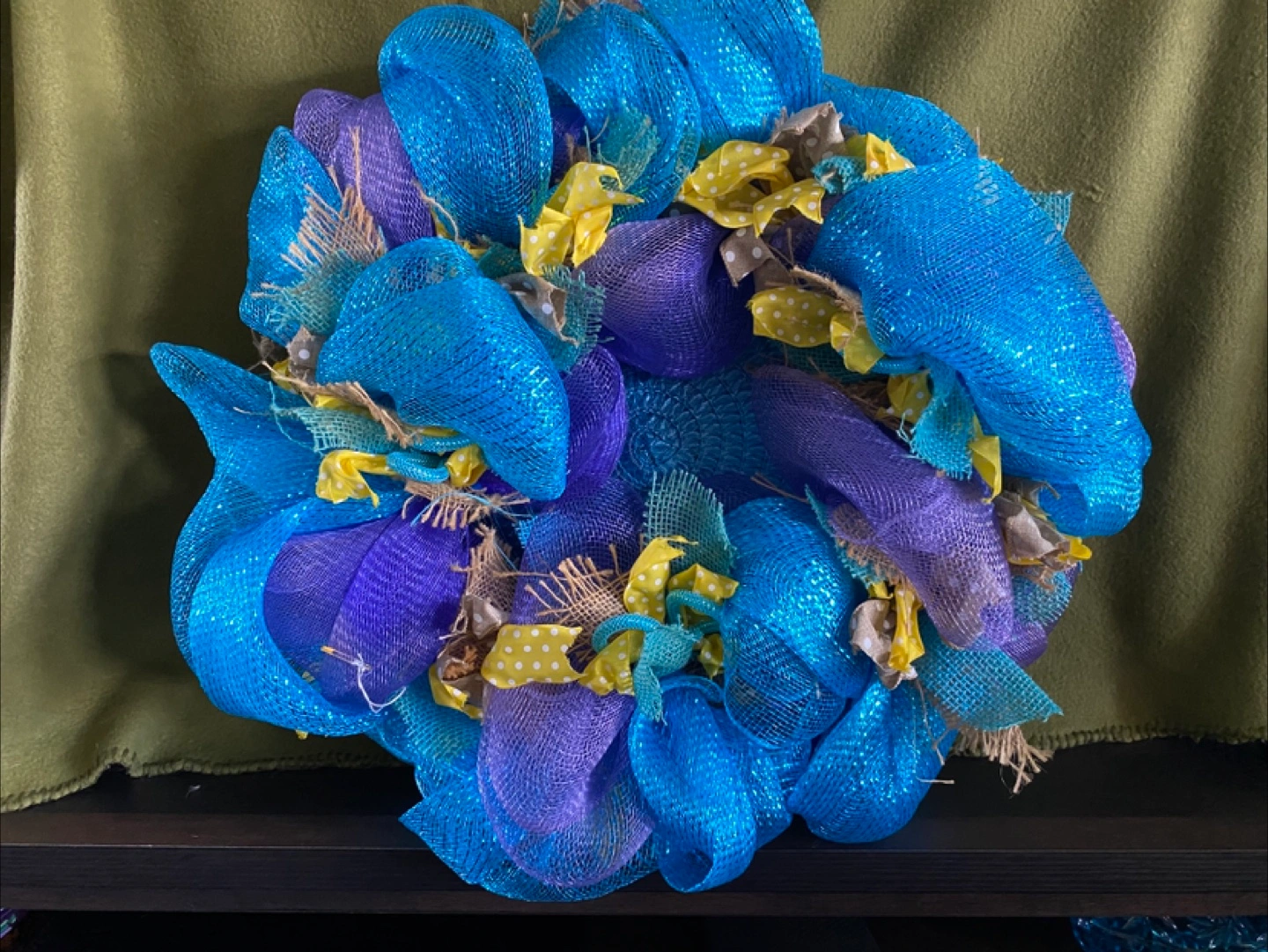 Check out this beautiful handmade wreath! It features a vibrant mix of blue and purple mesh, accented with yellow polka-dot ribbons and burlap. It's perfect for adding a pop of colour to your door or wall