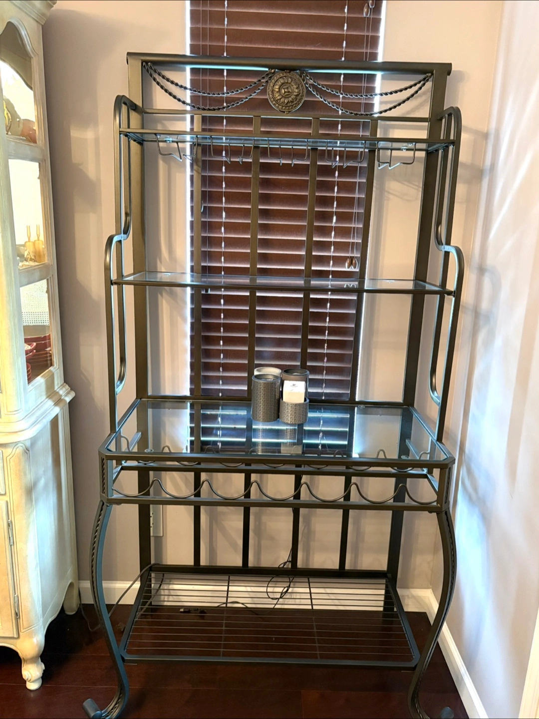 Selling a baker's rack with a metal frame and glass shelves! It is brand new and would be a lovely addition to any kitchen or dining area.