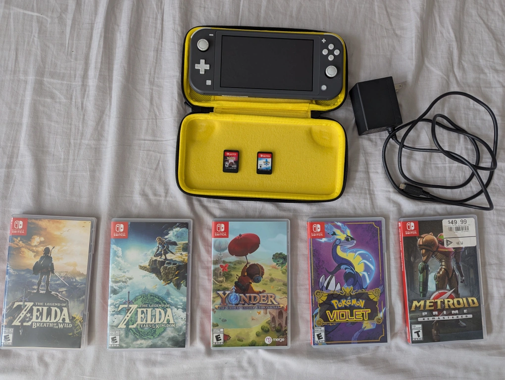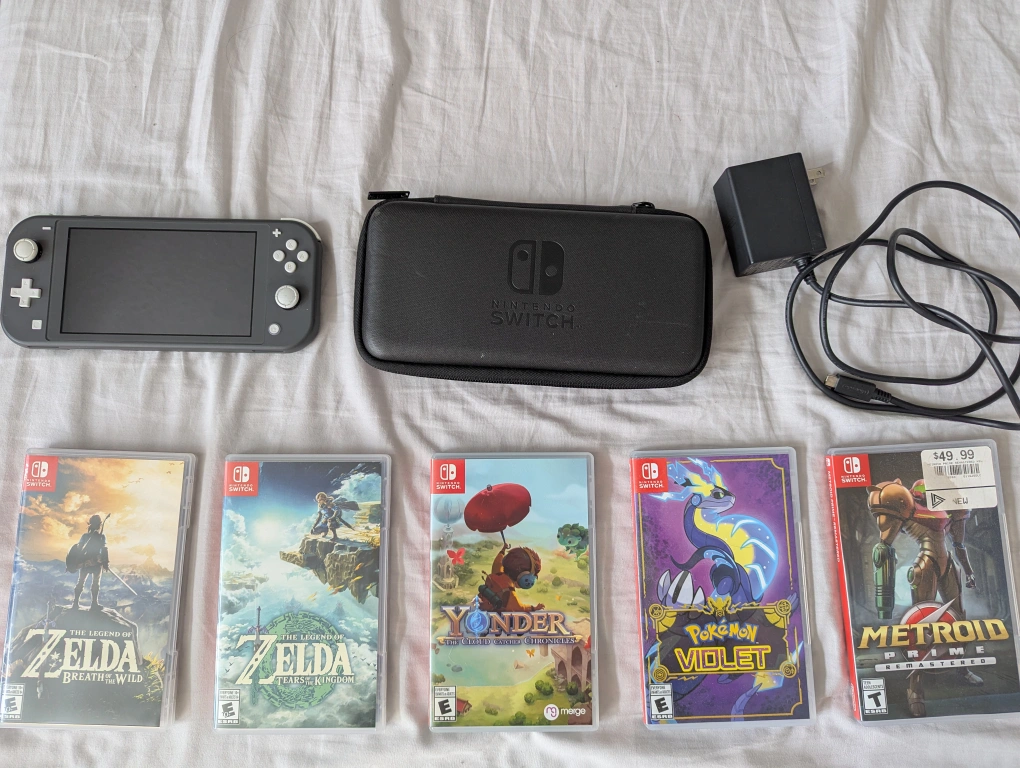 Selling my used switch lite in good condition (minor cosmetic damages) for: Console + accessories (charger and case) - $100 Games: Breath of the wild - $20 Tears of the Kingdom - $25 Yonder - $15 Pokemon Violet - $20 Pokemon Shining Pearl (no box) - $15 Pokemon Sword (no box) - $15 Metroid Prime - $30 Take all (console, accessories and games) for only $200. Prices are firm. Cash only.