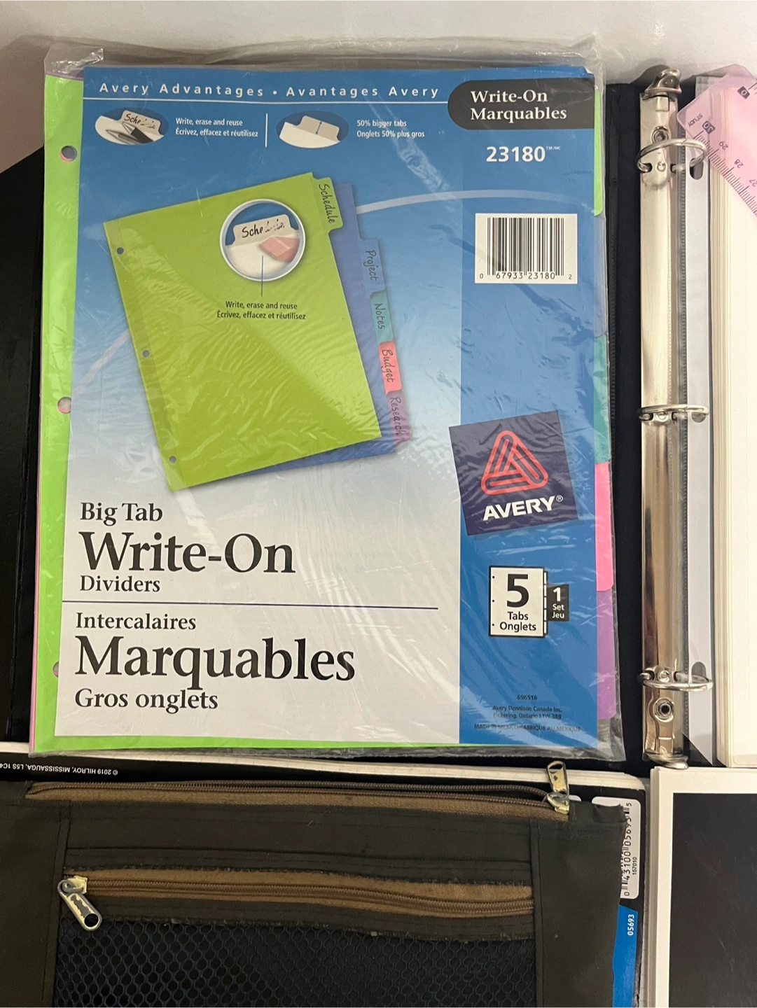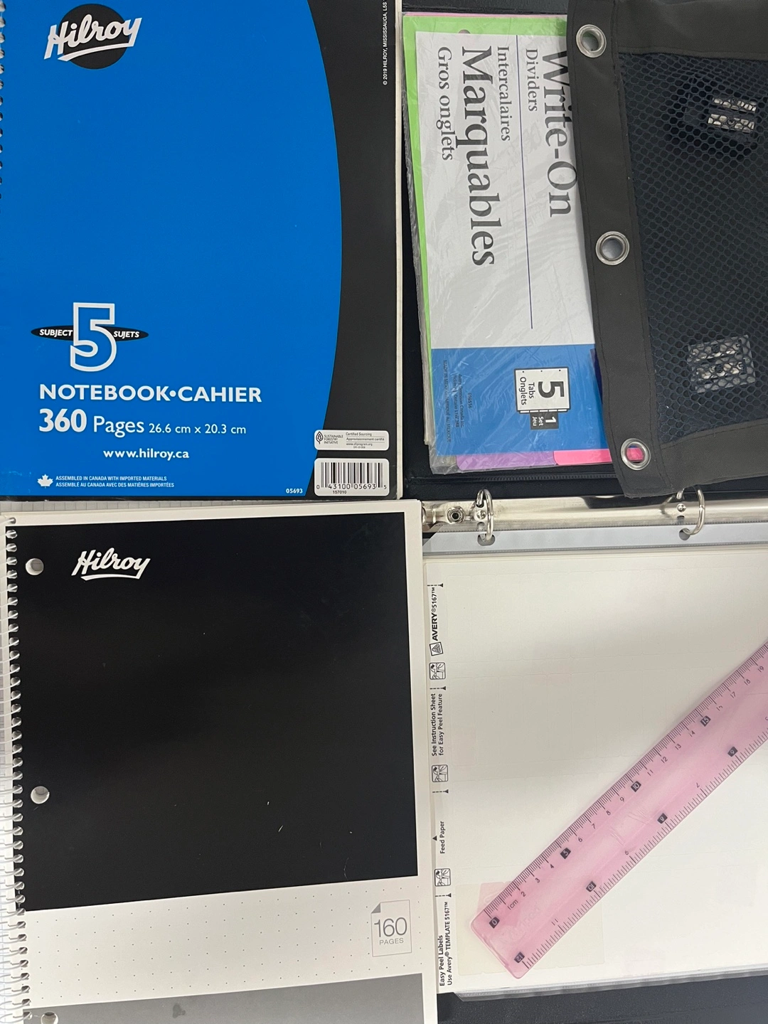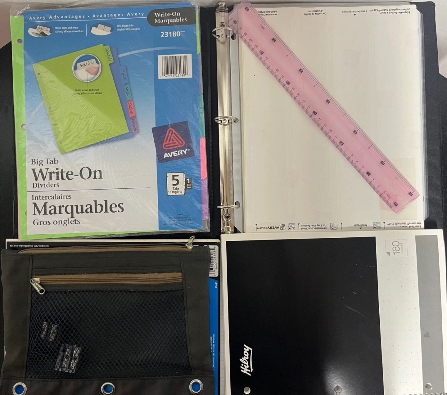 Getting ready for back to school? I'm selling a collection of school supplies, including: - A binder with a zippered pouch - Hilroy notebooks - Avery Write-On dividers - A ruler Perfect for students of all ages!