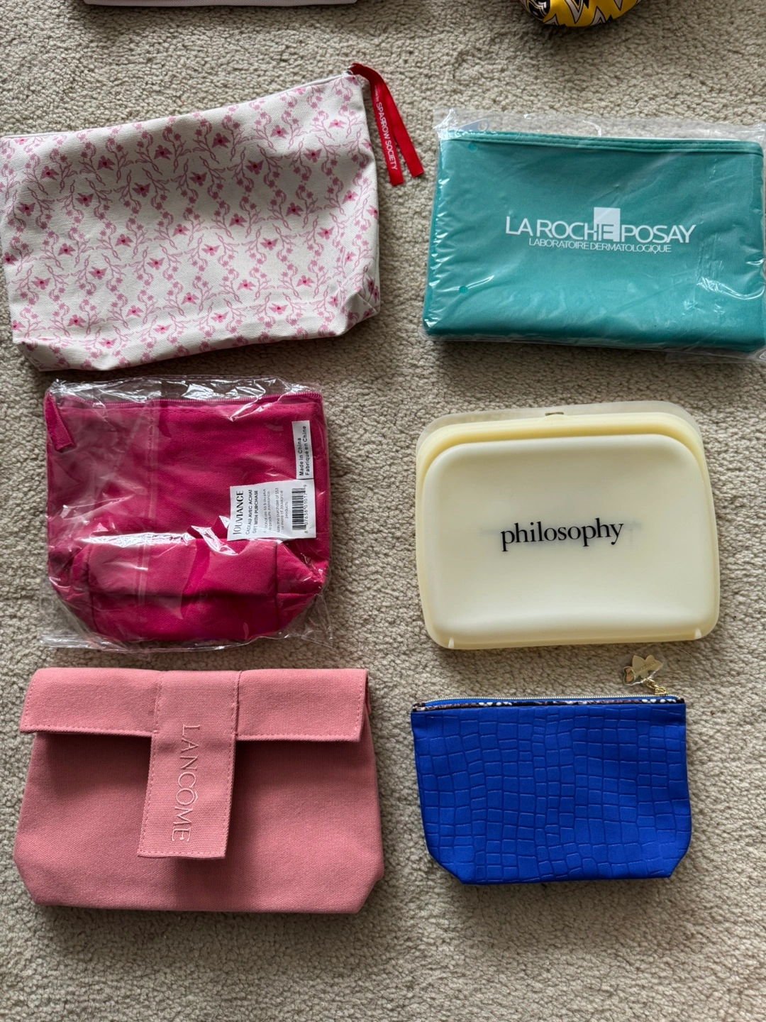 Selling a collection of cosmetic bags from various brands like Lancôme, Kiehl's, La Roche-Posay, Philosophy, and Shiseido! They are all in great condition and perfect for organizing your makeup and skincare products. A great way to keep everything tidy and travel-ready