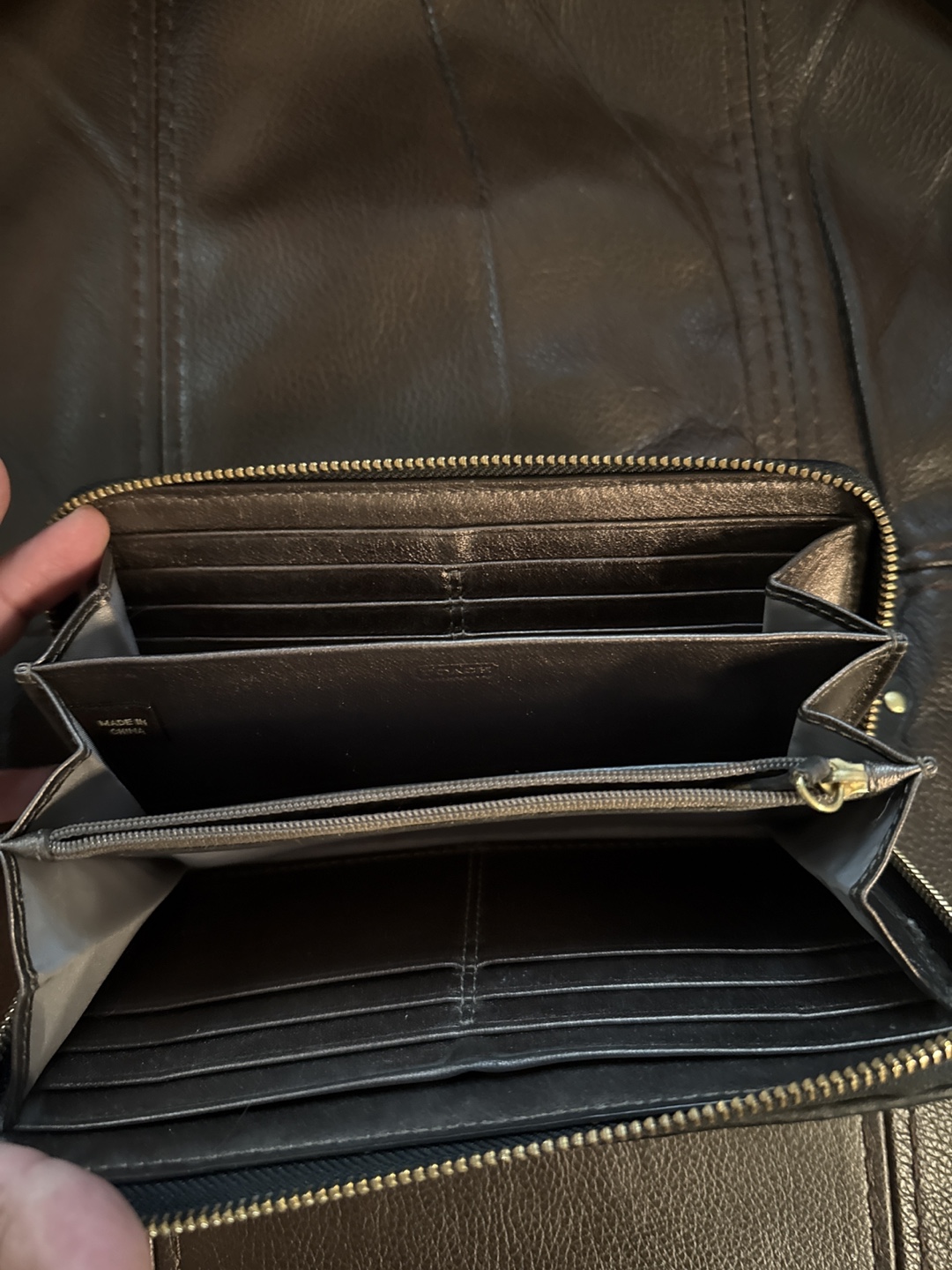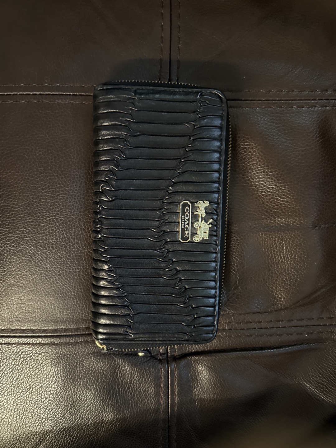 Selling a black leather Coach wallet. It has a zip-around closure and plenty of slots for cards and cash. It's in good condition and ready for a new home