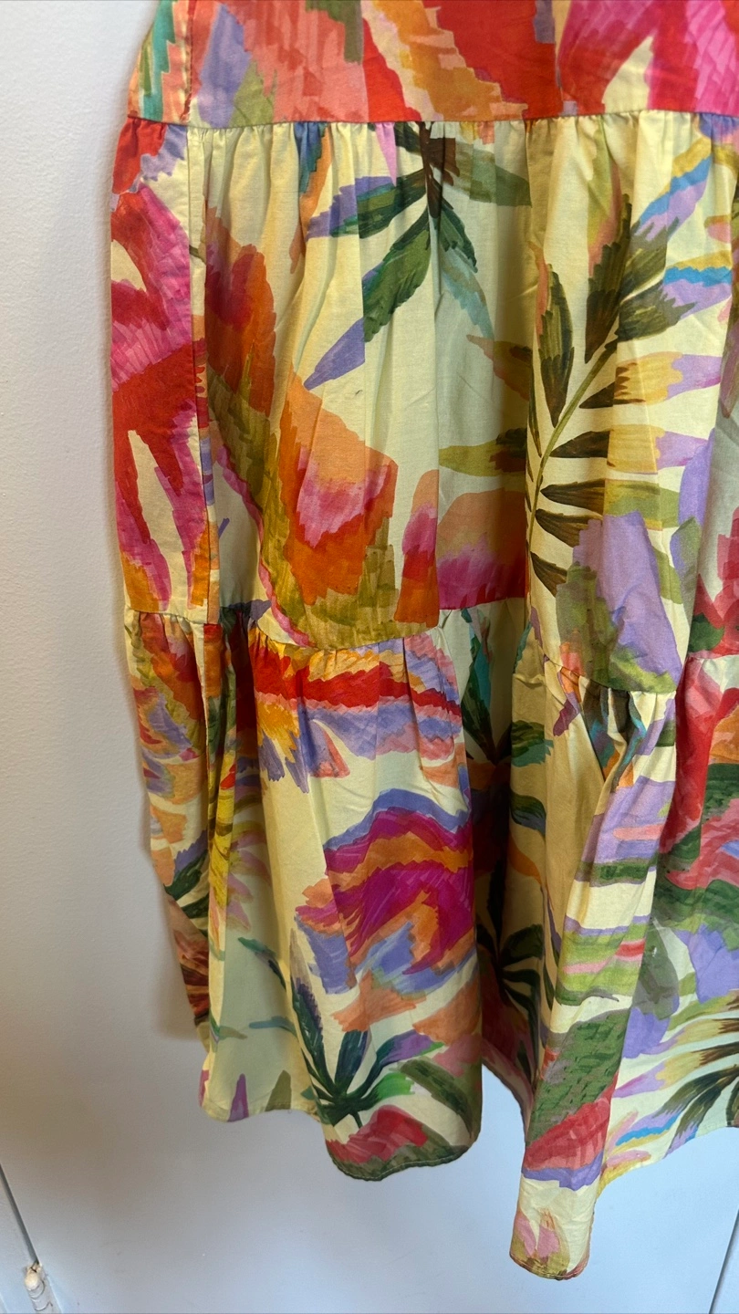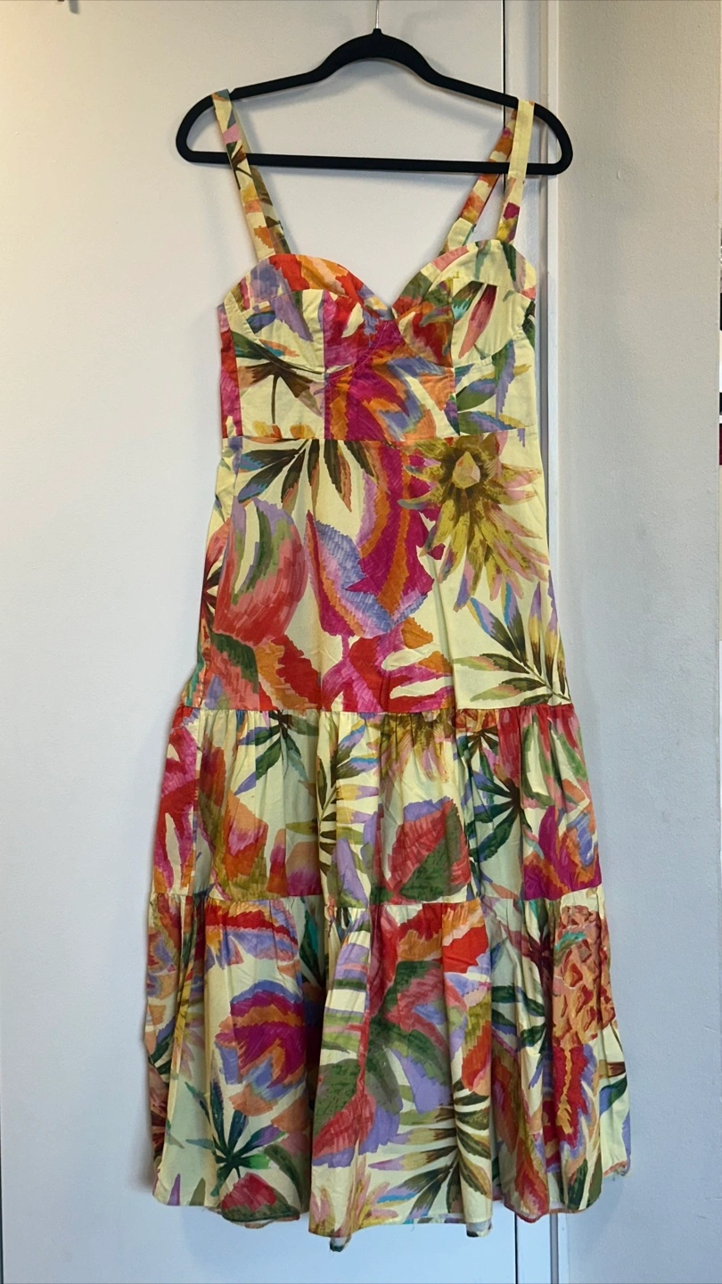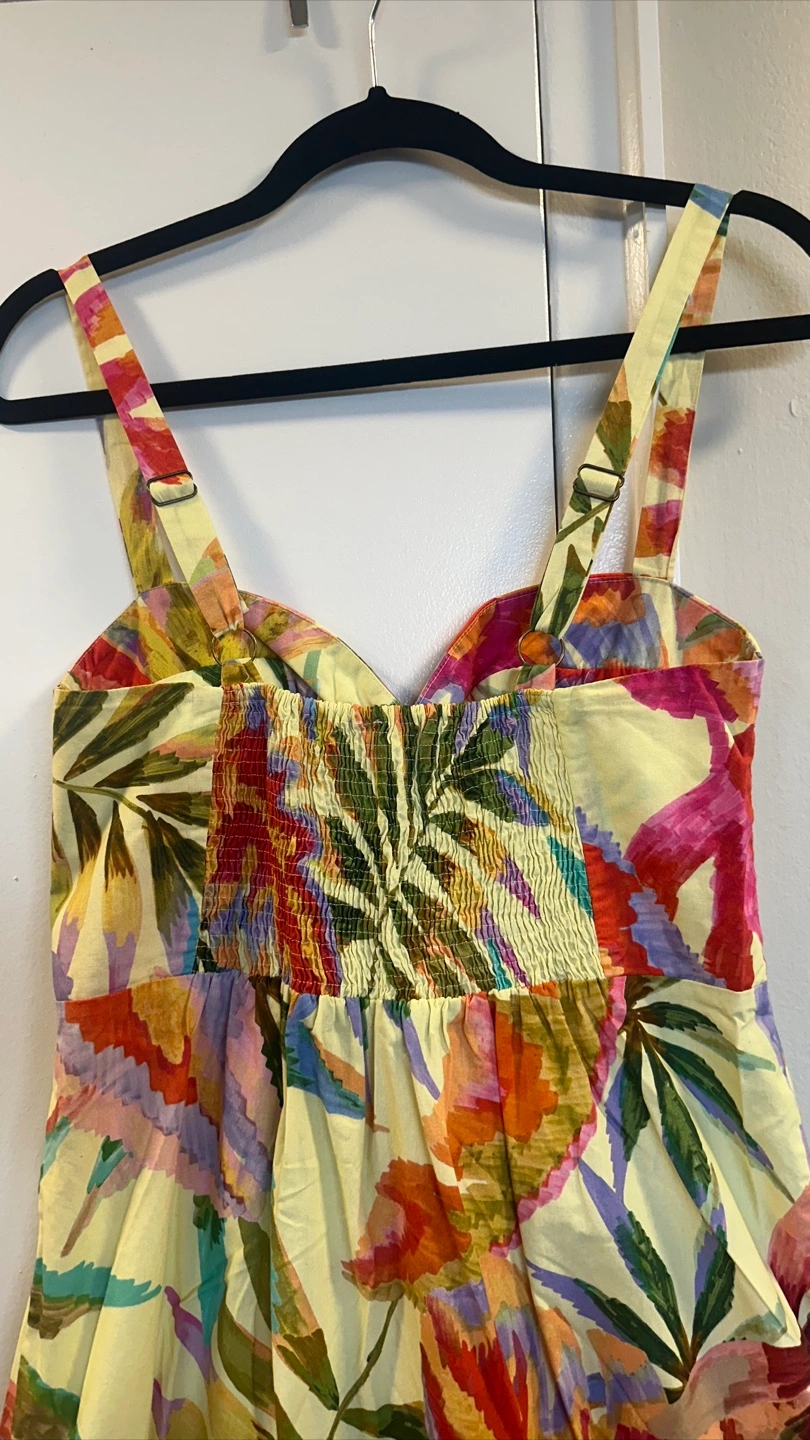 This is a beautiful Farm Rio dress with a vibrant floral print. It features a tiered design and adjustable straps. Perfect for summer!
