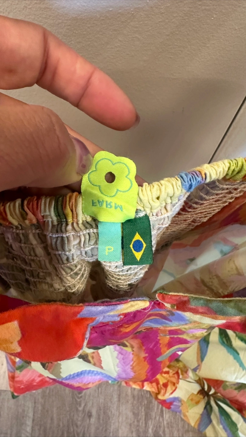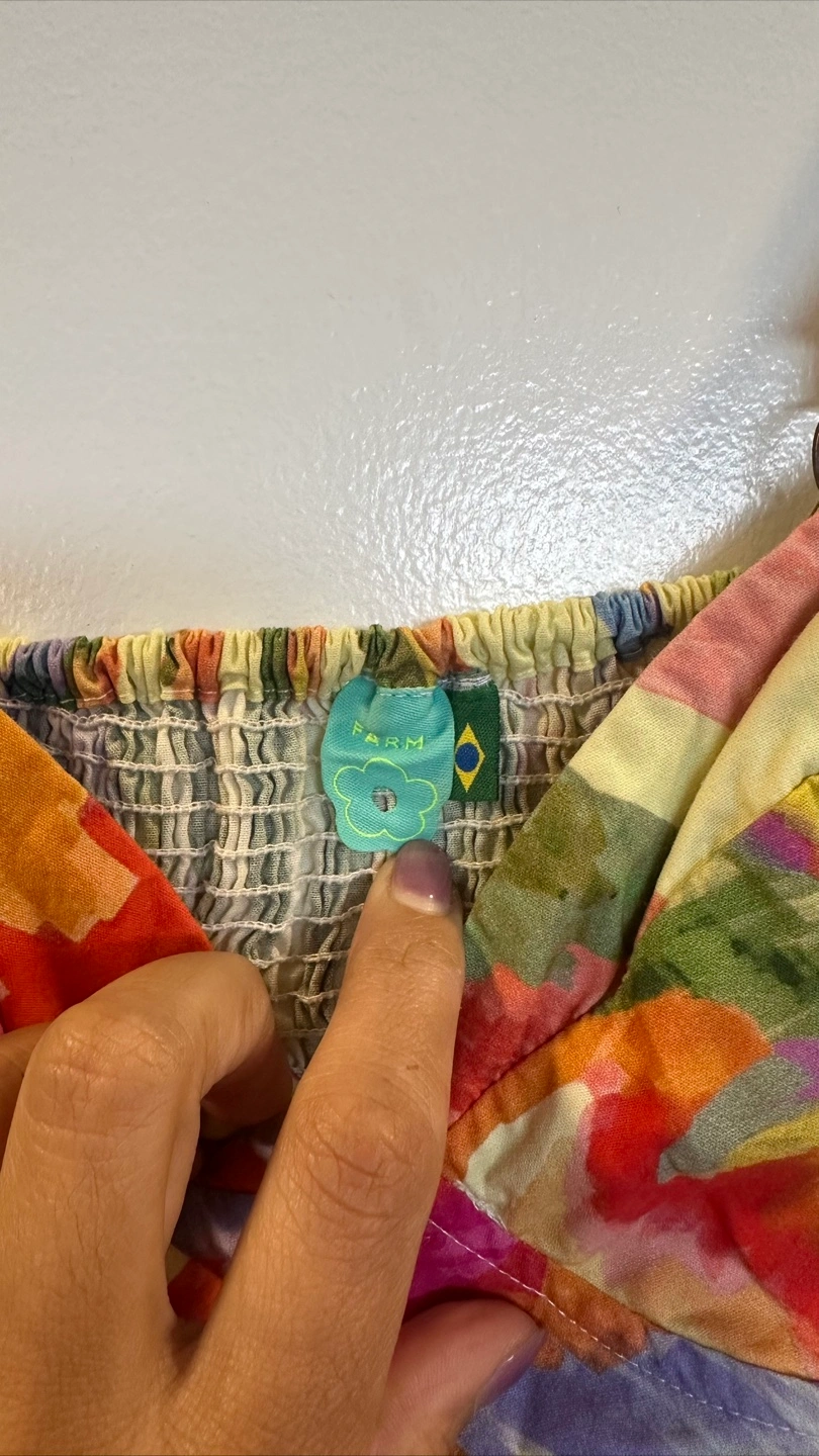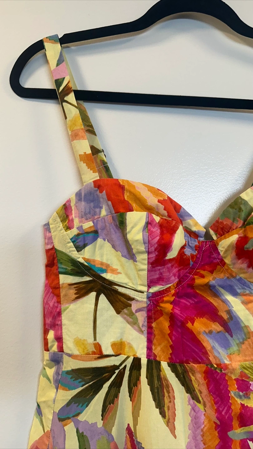 This is a beautiful Farm Rio dress with a vibrant floral print. It features a tiered design and adjustable straps. Perfect for summer!