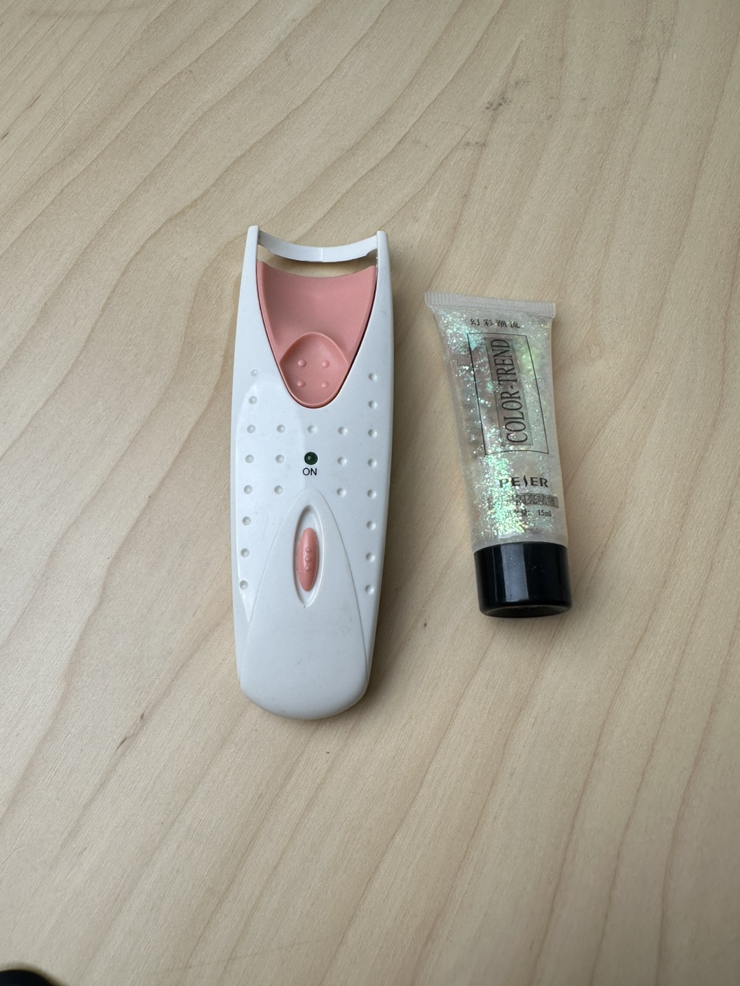 I'm selling heating eyelash curler and a Color Trend glitter tube. The eyelash curler needs new battery.