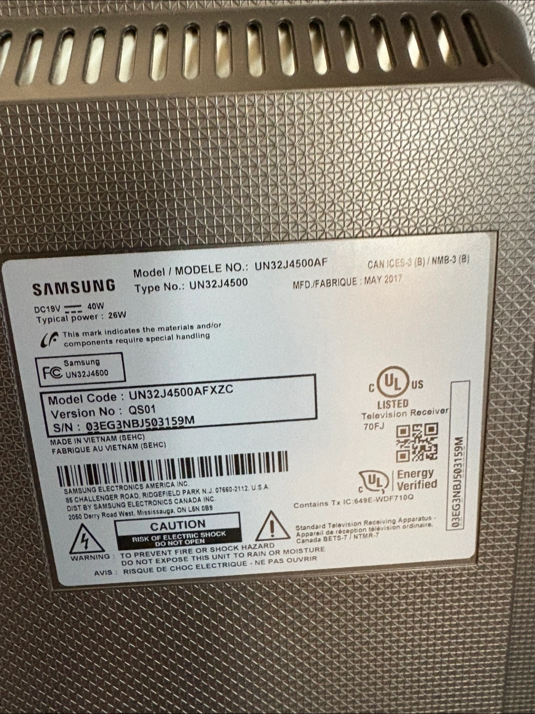 137Selling a Samsung 32 inch TV, model number UN32J4500AF. It's new and comes with a remote. The TV was manufactured in May 2017. Perfect for a smaller space or as a secondary screen!