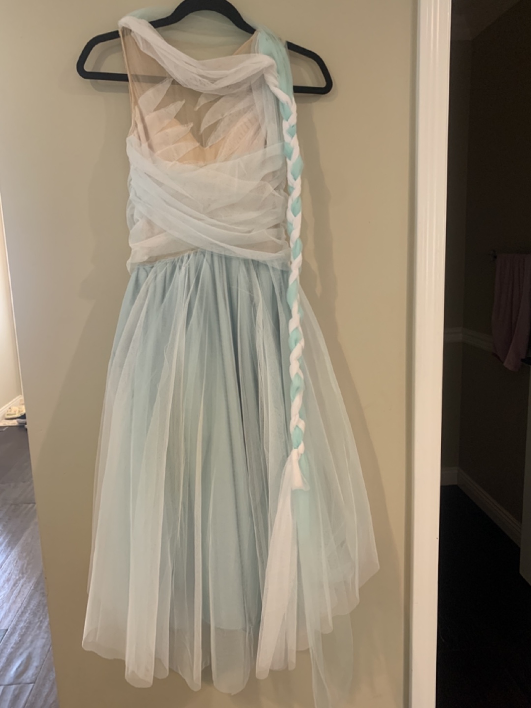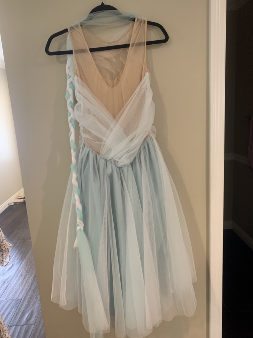 Selling a beautiful ballet dress in light blue and white. It features a unique design with tulle and a decorative braid. Perfect for performances.