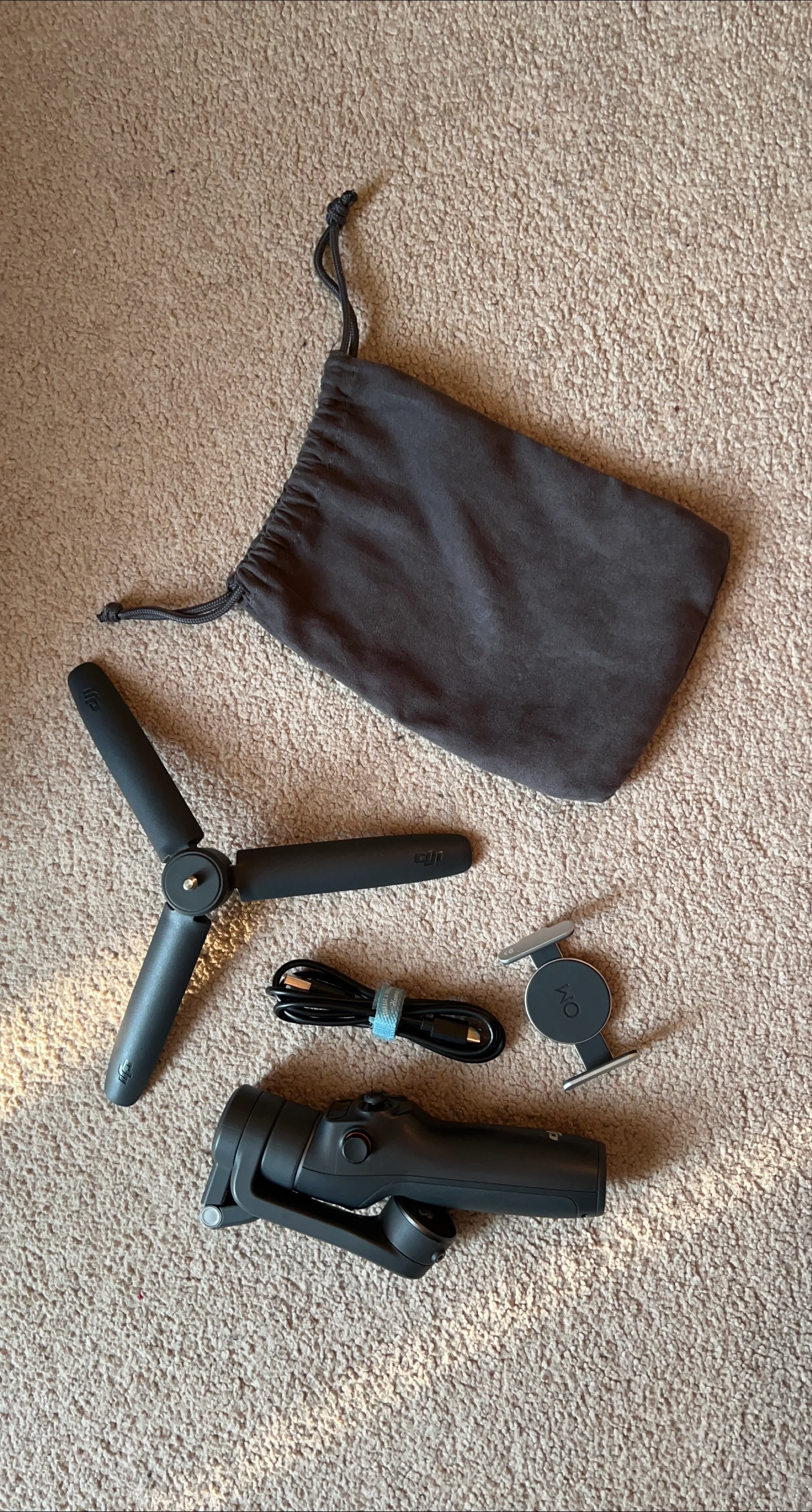 Selling a DJI Osmo Mobile gimbal stabilizer! It comes with the tripod, magnetic phone clamp, USB-C charging cable, and carrying pouch. Great for smooth video recording on the go.
