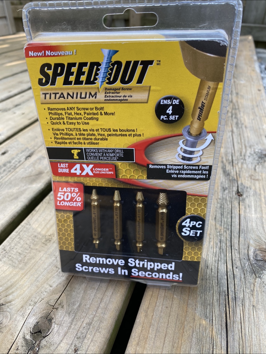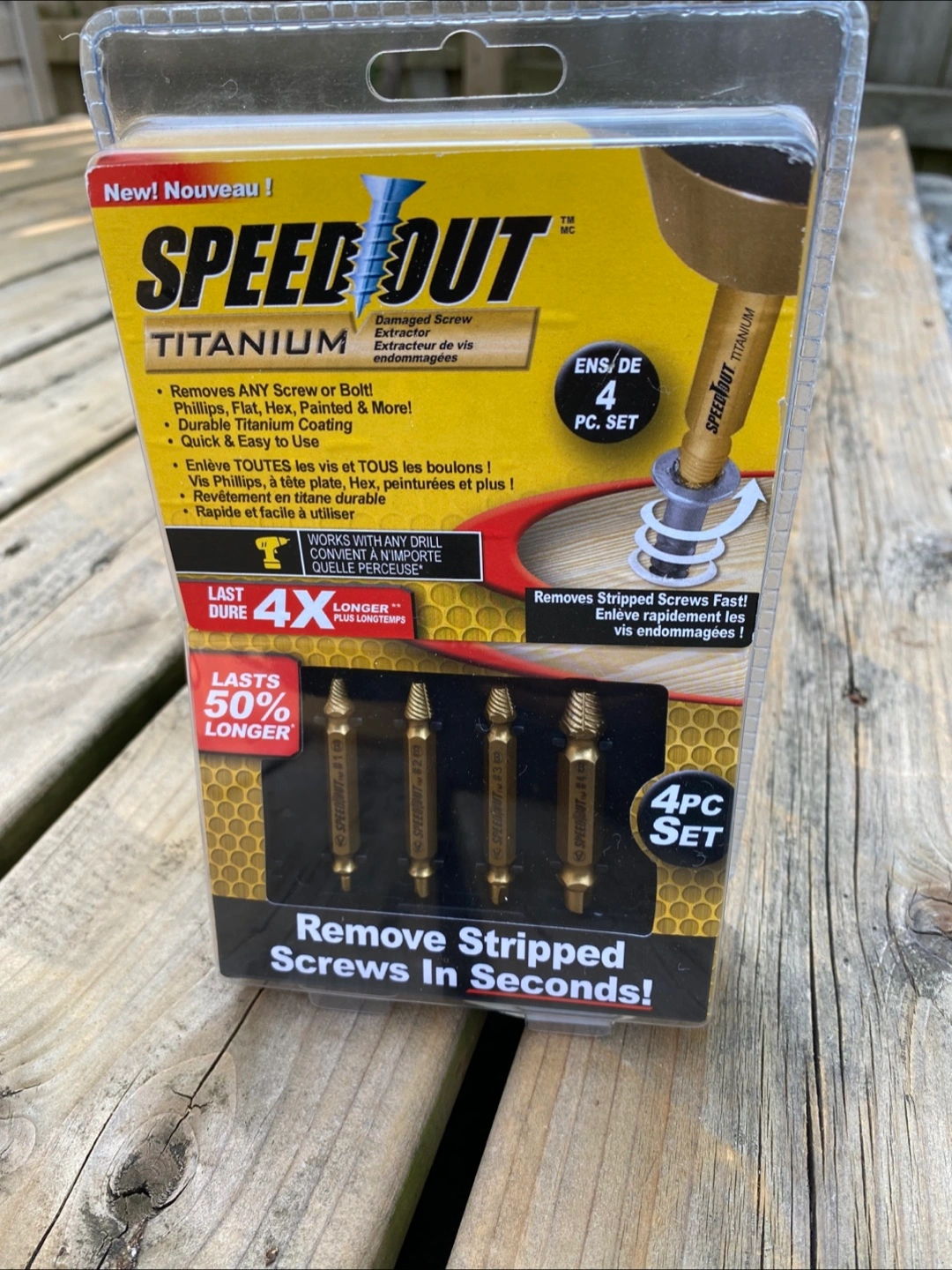 Selling a Speed Out Titanium Damaged Screw Extractor set. This 4-piece set is designed to remove any screw or bolt, including Phillips, flat, hex, painted, and more! It's quick and easy to use and works with any drill. The titanium coating provides heavy-duty performance for extended life, reducing heat buildup. It's self-centering, so no walking. Great for mechanics, repairmen, boat owners, and DIY enthusiasts! Comes in a durable storage case.