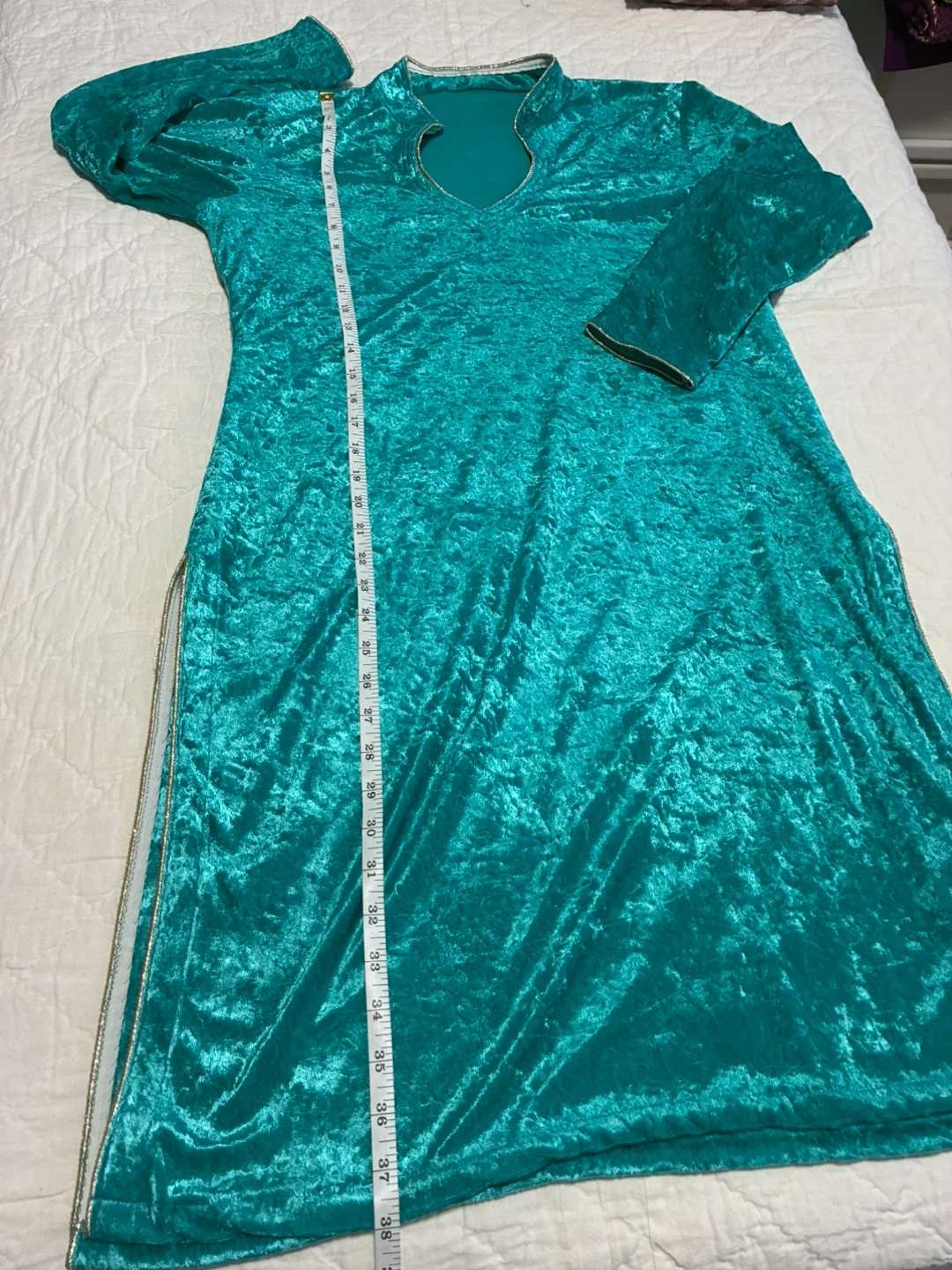 This is a teal crushed velvet kurti. It measures approximately 38 inches in length. The material is soft and textured with gold trim accents.
