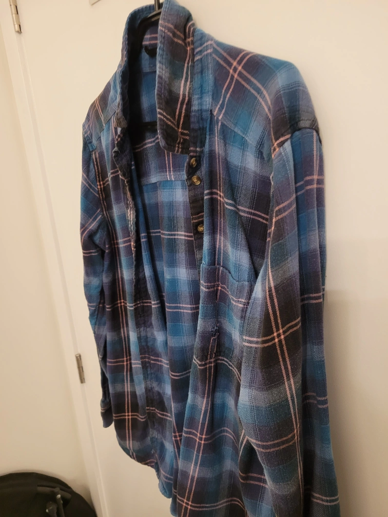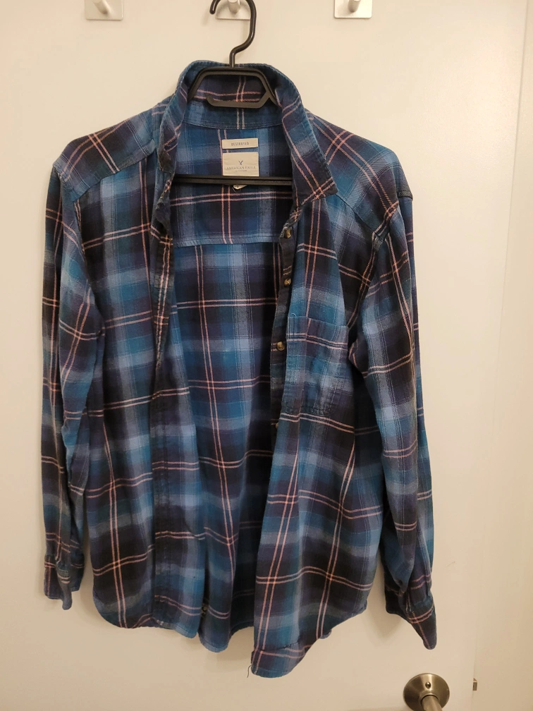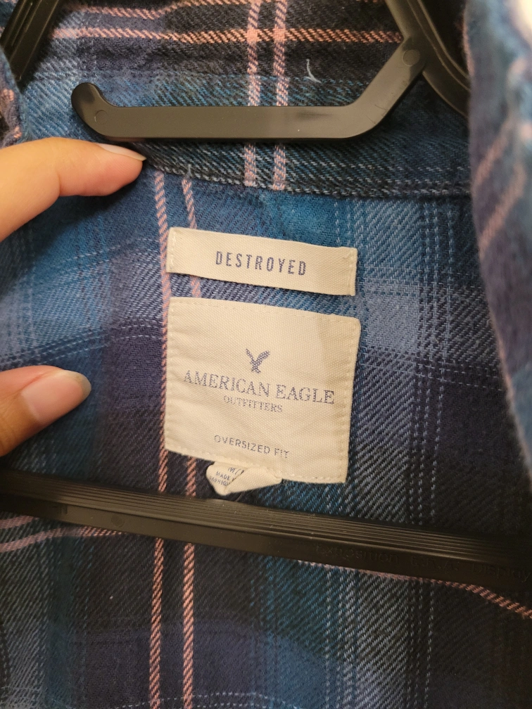 Cozy American Eagle flannel shirt in an oversized fit! It's a blue plaid pattern that's perfect for layering. Great for a casual, relaxed look