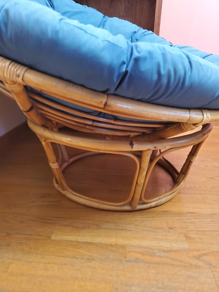 Selling a comfy papasan chair! It comes with the two small blue and green cushion. It has some stains. You can figure a way to clean it. Perfect for adding a cozy touch to any room. Selling it because we are making space as well it's not being used as much anymore. other than the stains. there's no damages. These are $100-$500 brand new online. Asking for $40.