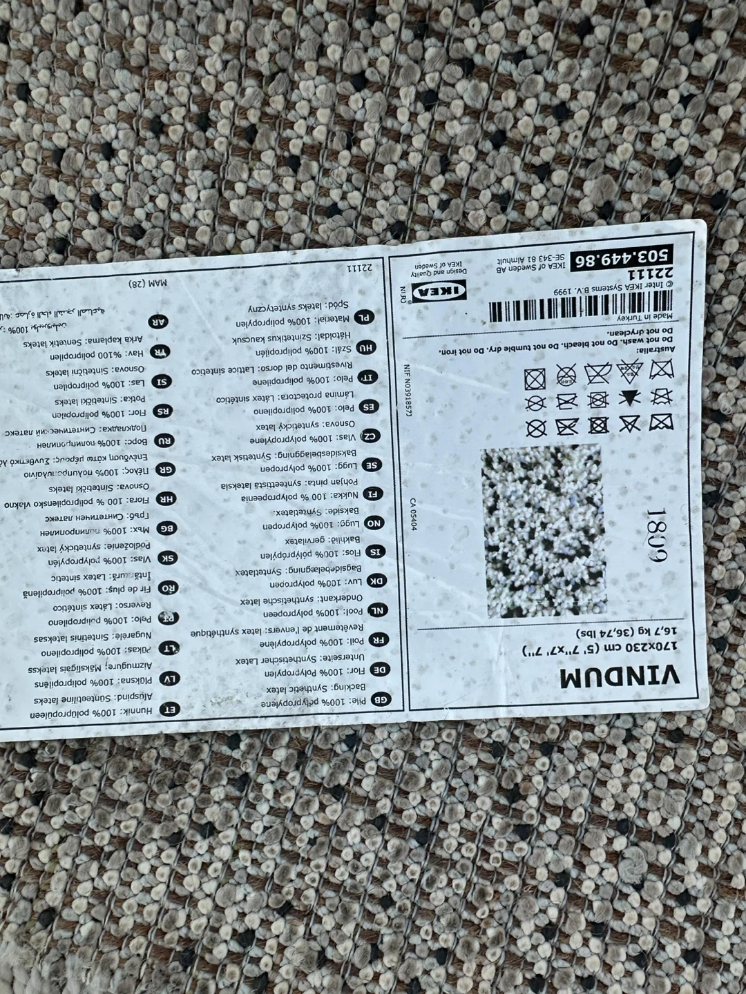 Selling a gently used IKEA VINDUM rug. It measures 170x230 cm (5'7"x7'7") and is made of 100% polypropylene. The backing is synthetic latex. It's in good condition, clean just washed