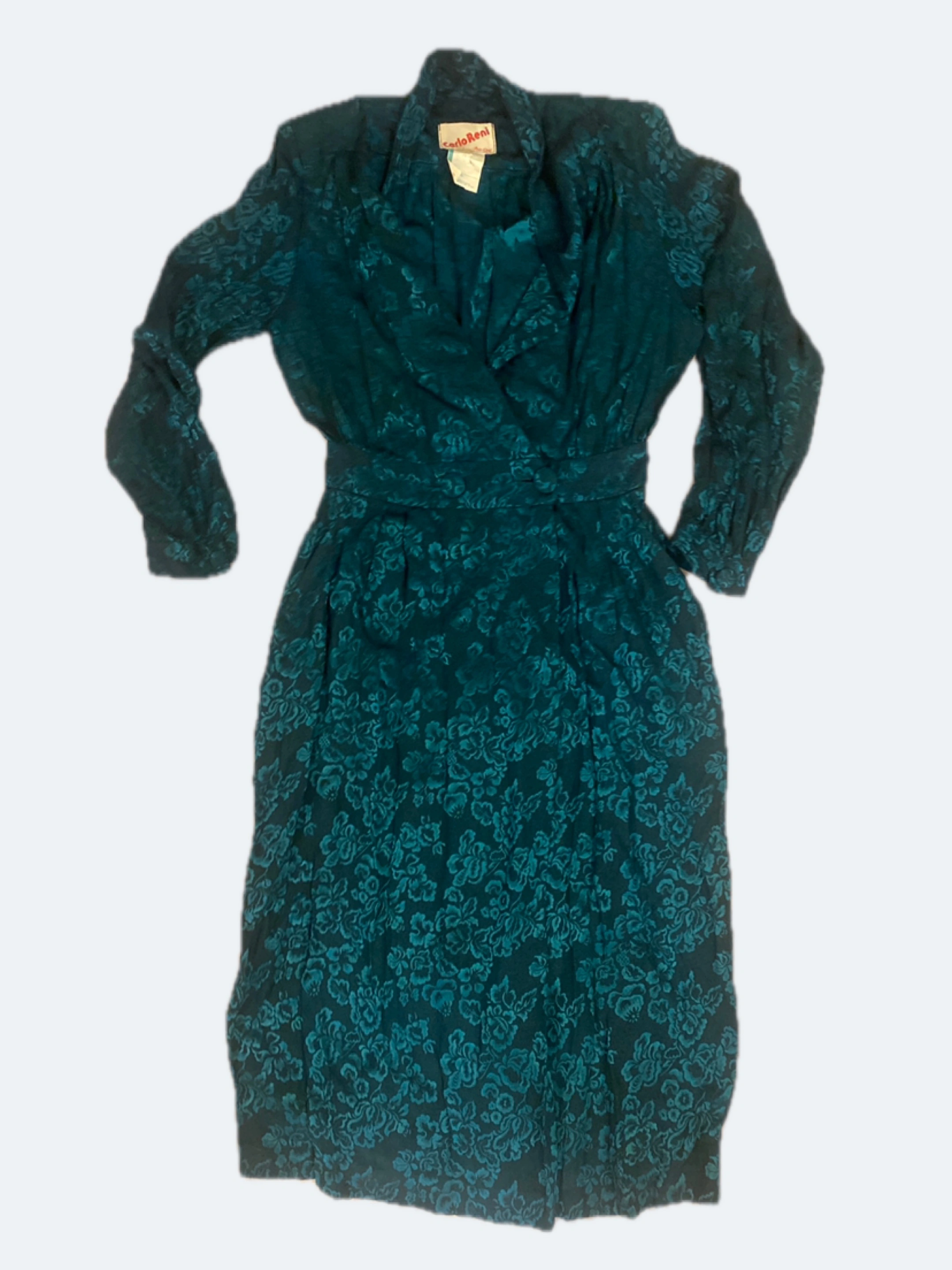 VINTAGE Carlo Reni dress in an Emerald teal green brocade floral pattern. It's a unique piece with POCKETS!!! Mid length. Fits a size 24-26”Perfect for adding a touch of elegance to your wardrobe!