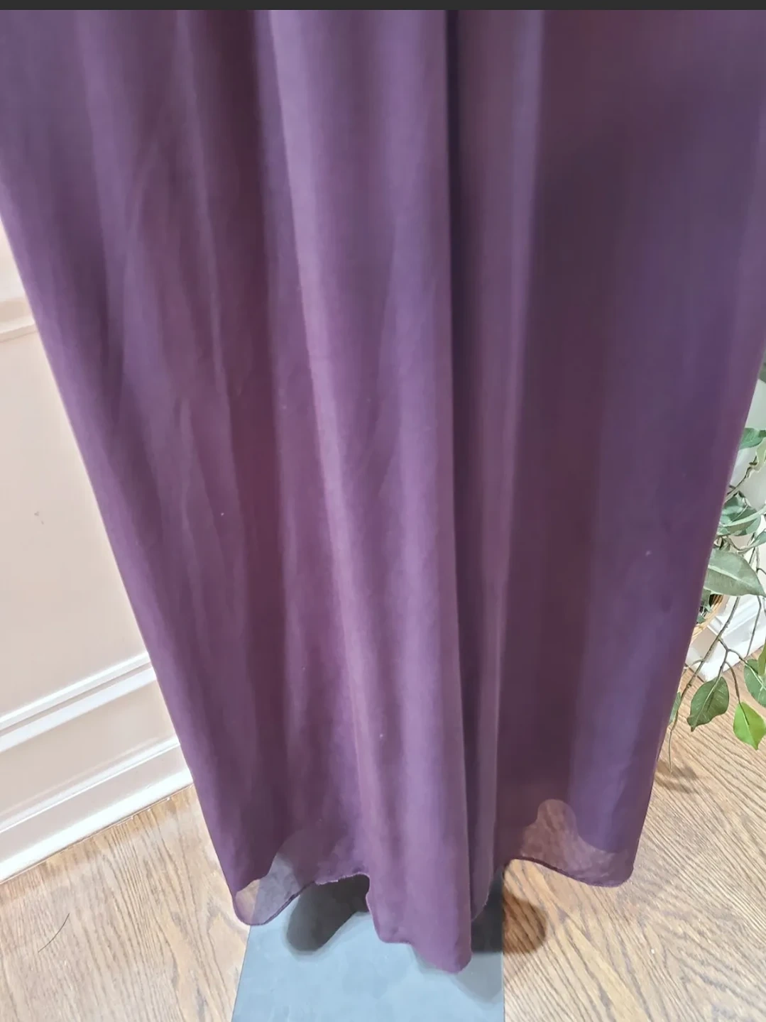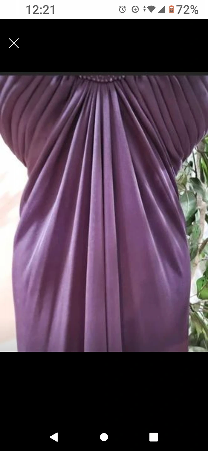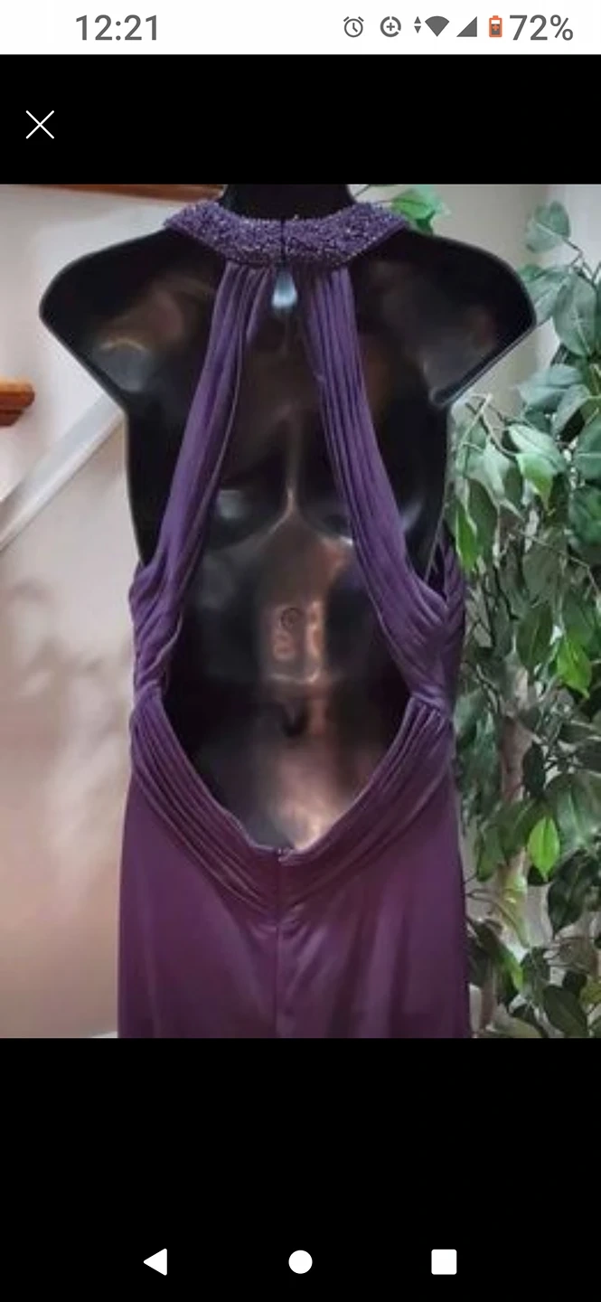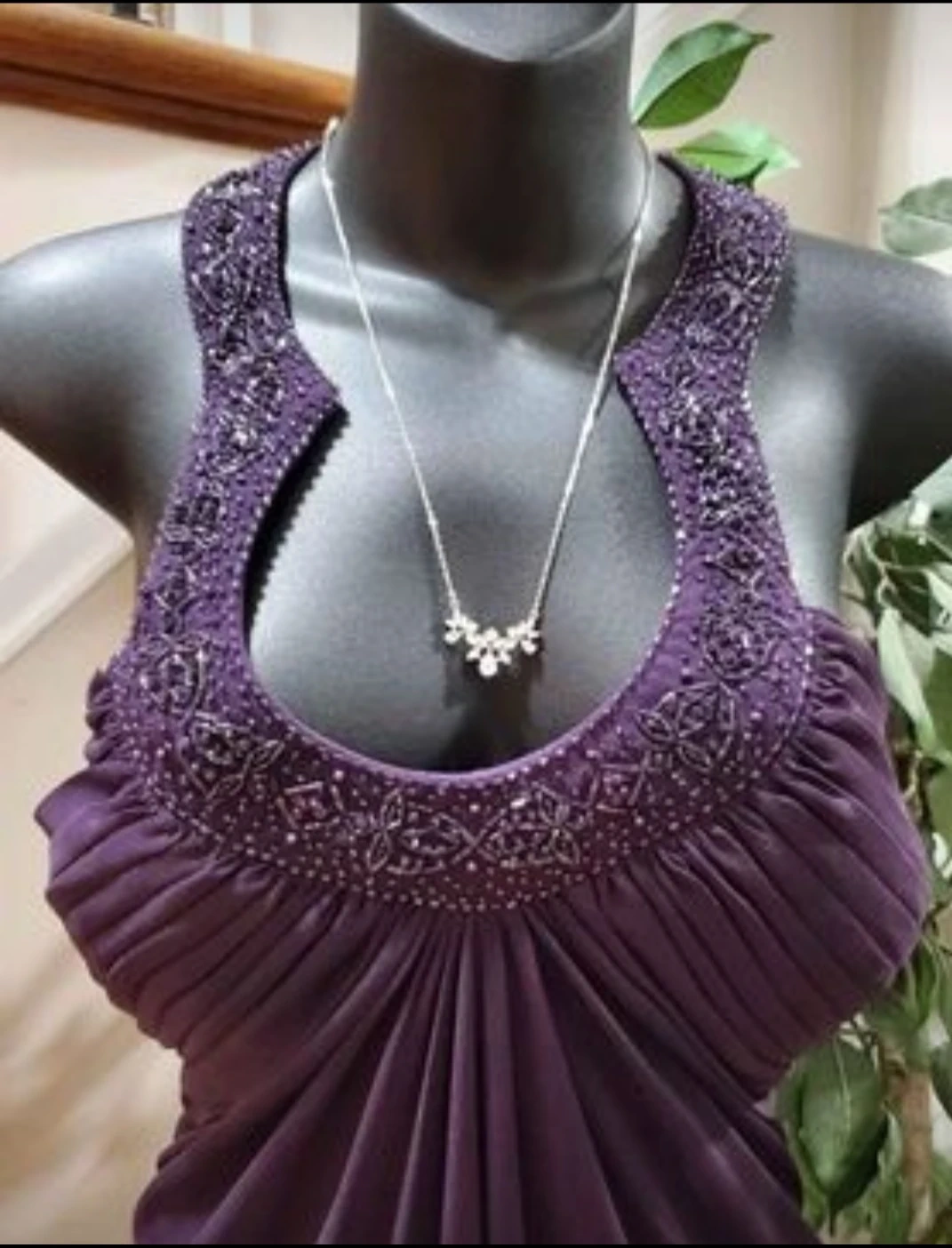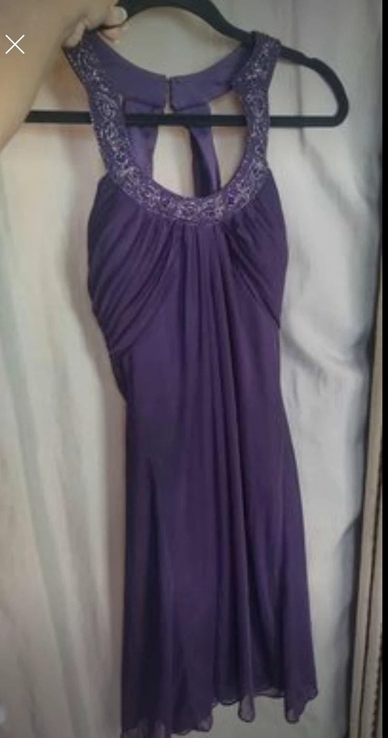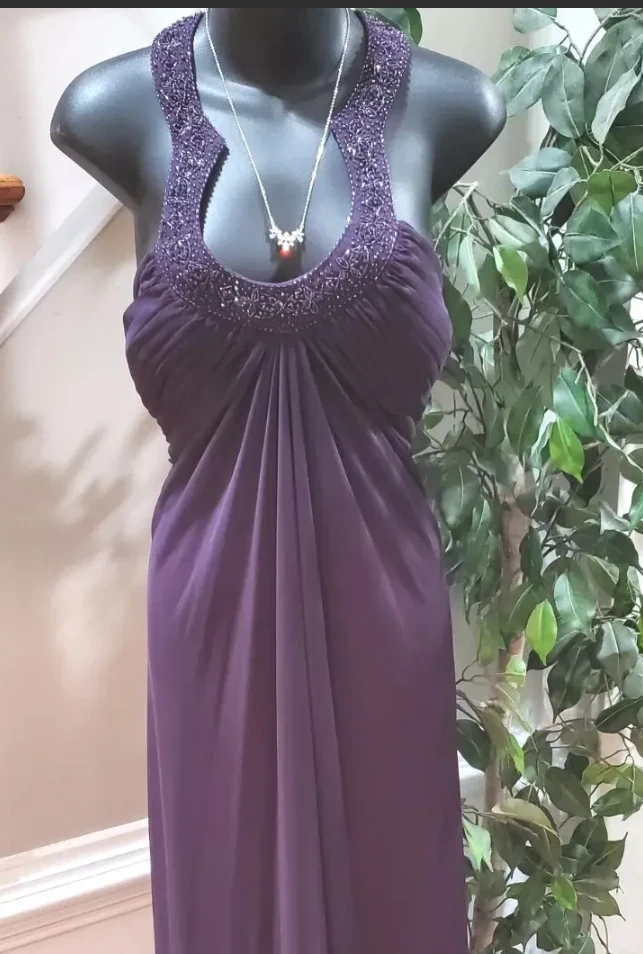 Beautiful Halter Dress Beaded Neckline,Pleated Bust, Knee Length, Open Back In Eggplant. Worn once. Size 10.