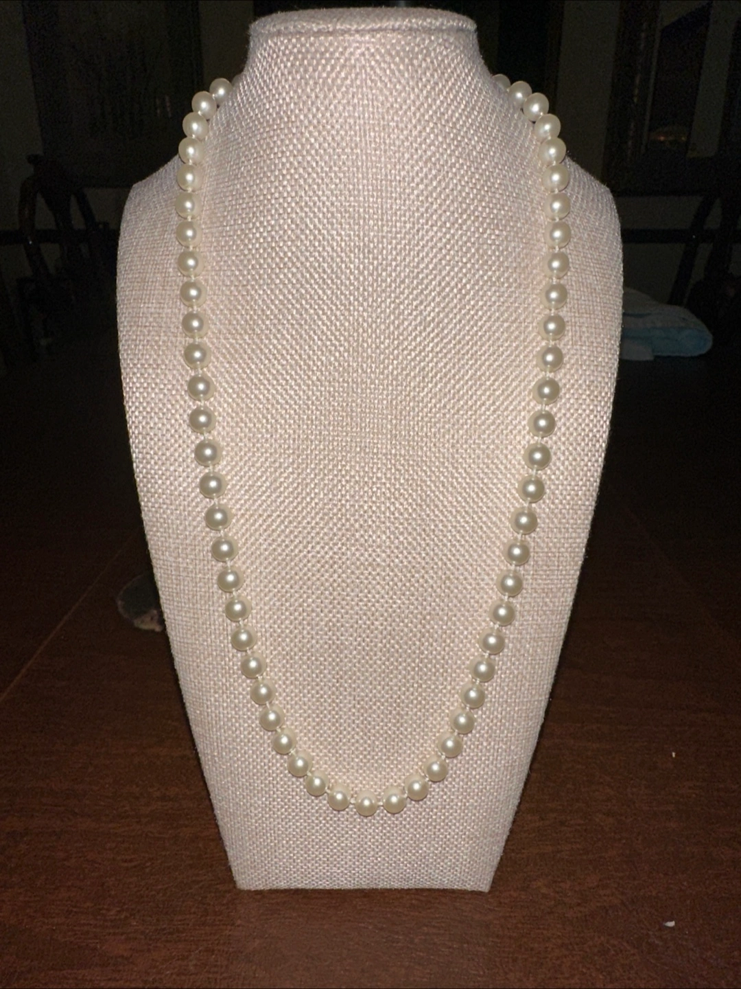 Classic pearl necklace, perfect for any occasion! The pearls are a beautiful off-white color and in excellent condition. It's a timeless piece that will add a touch of elegance to your wardrobe
