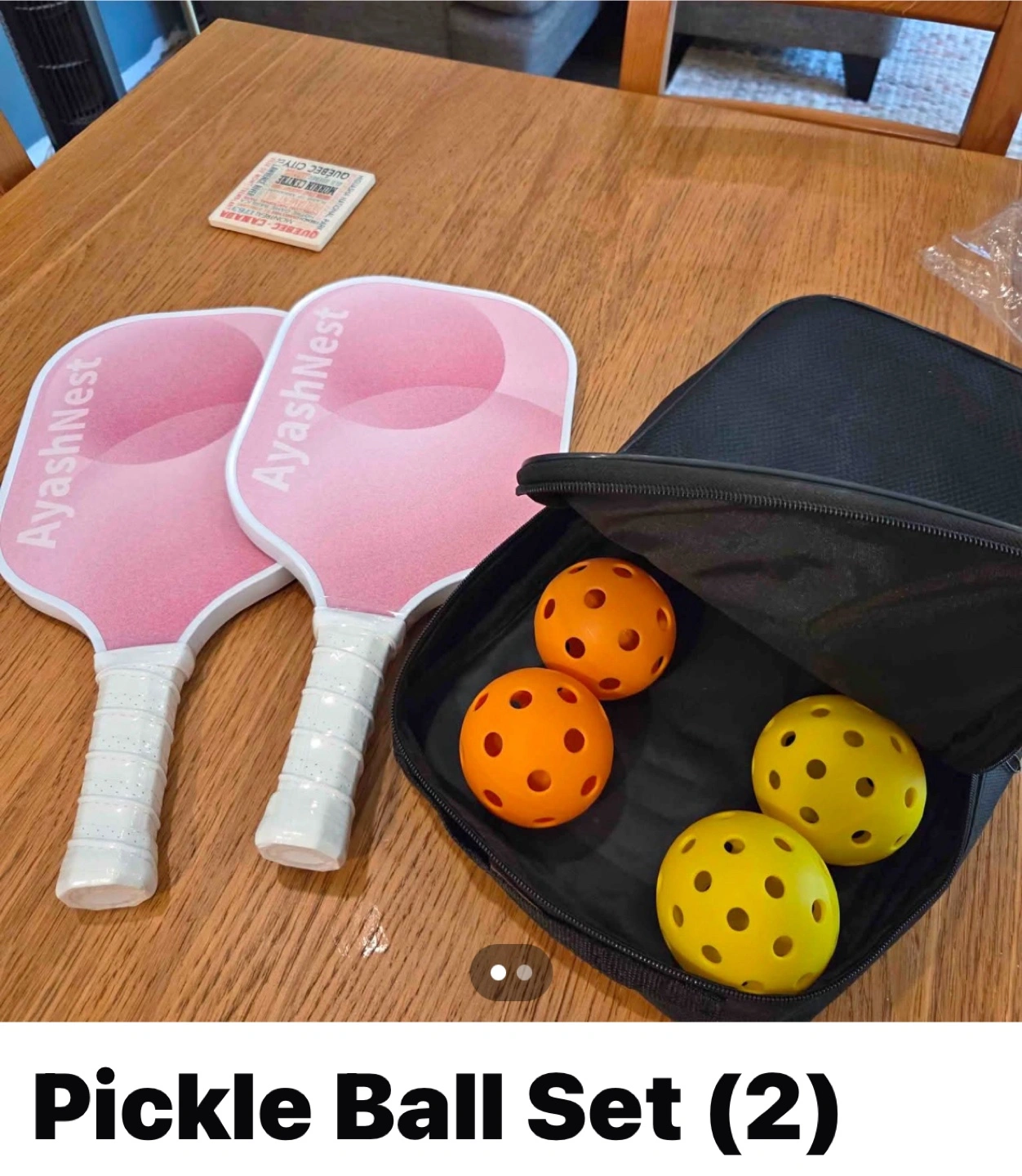 Selling an AyashNest pickleball set that includes two paddles and four balls. The paddles are pink and white, and the balls are a mix of orange and yellow. Comes with a carrying case for easy storage and transport. Great for some fun in the sun!