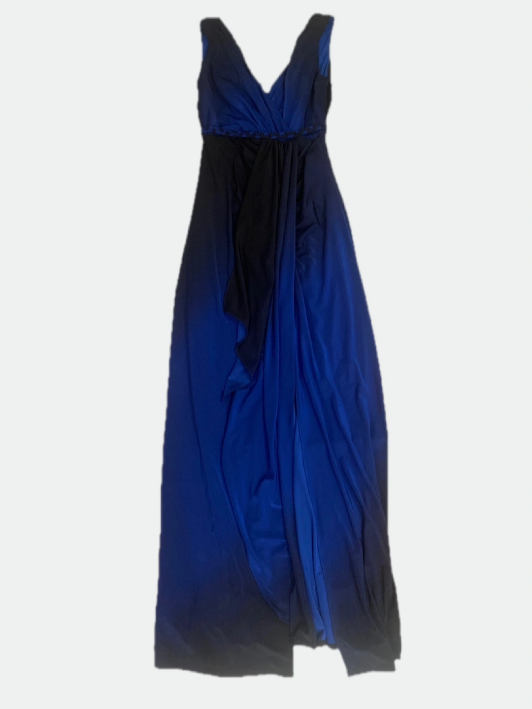 This Cobalt-Midnight blue evening gown in a beautiful ombré fabric is a stunner!!!A perfect evening gown!!! Grecian style draping on front and subtle ruching in the back to accentuate the silhouette. It is lined at bust area and features an enclosed zipper. There is slight stretch.