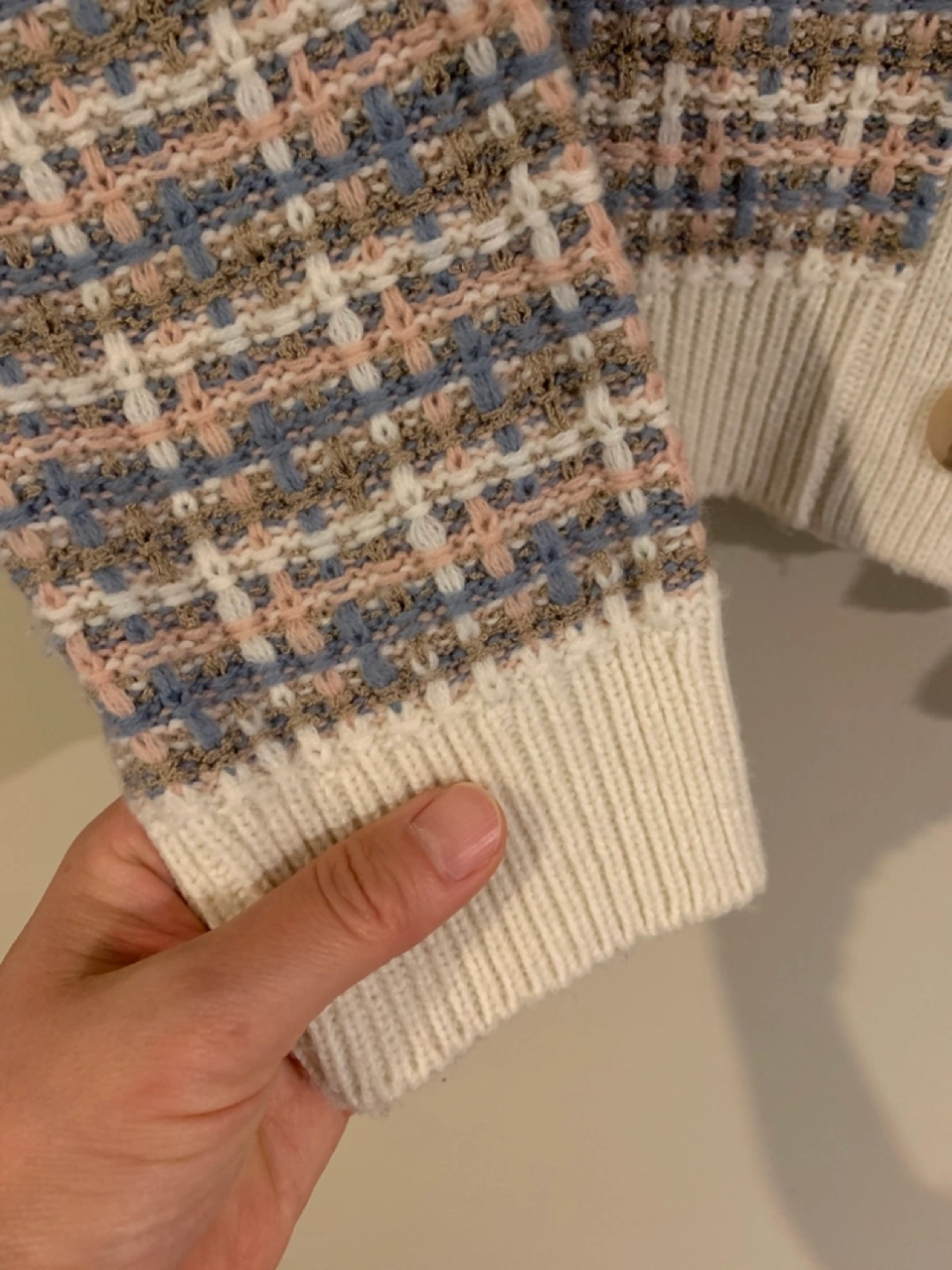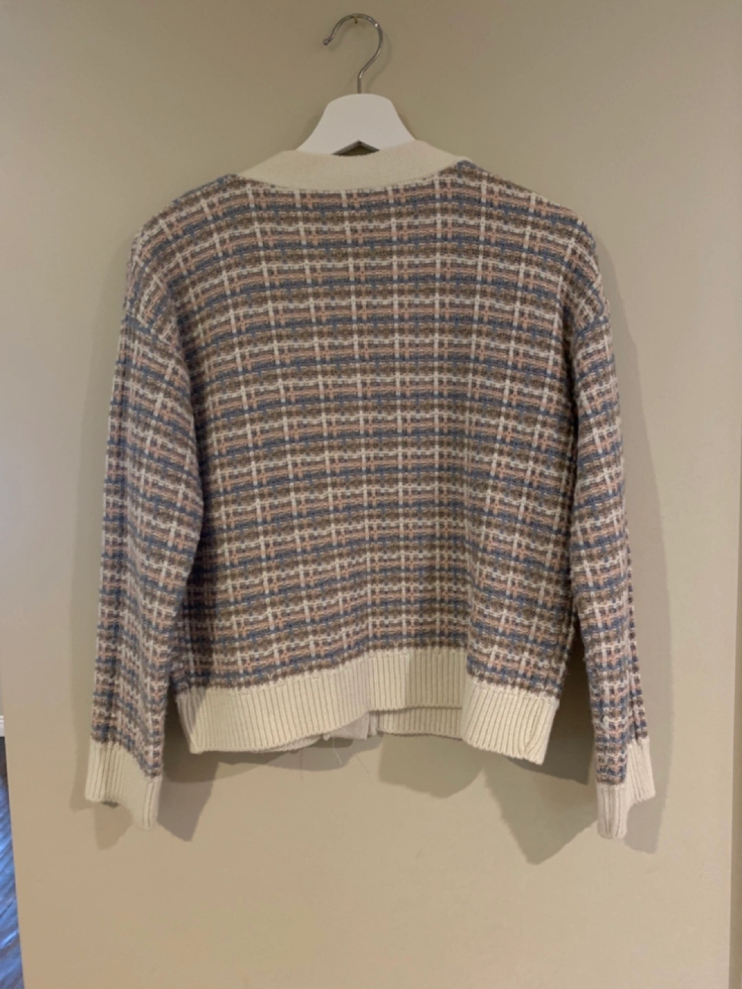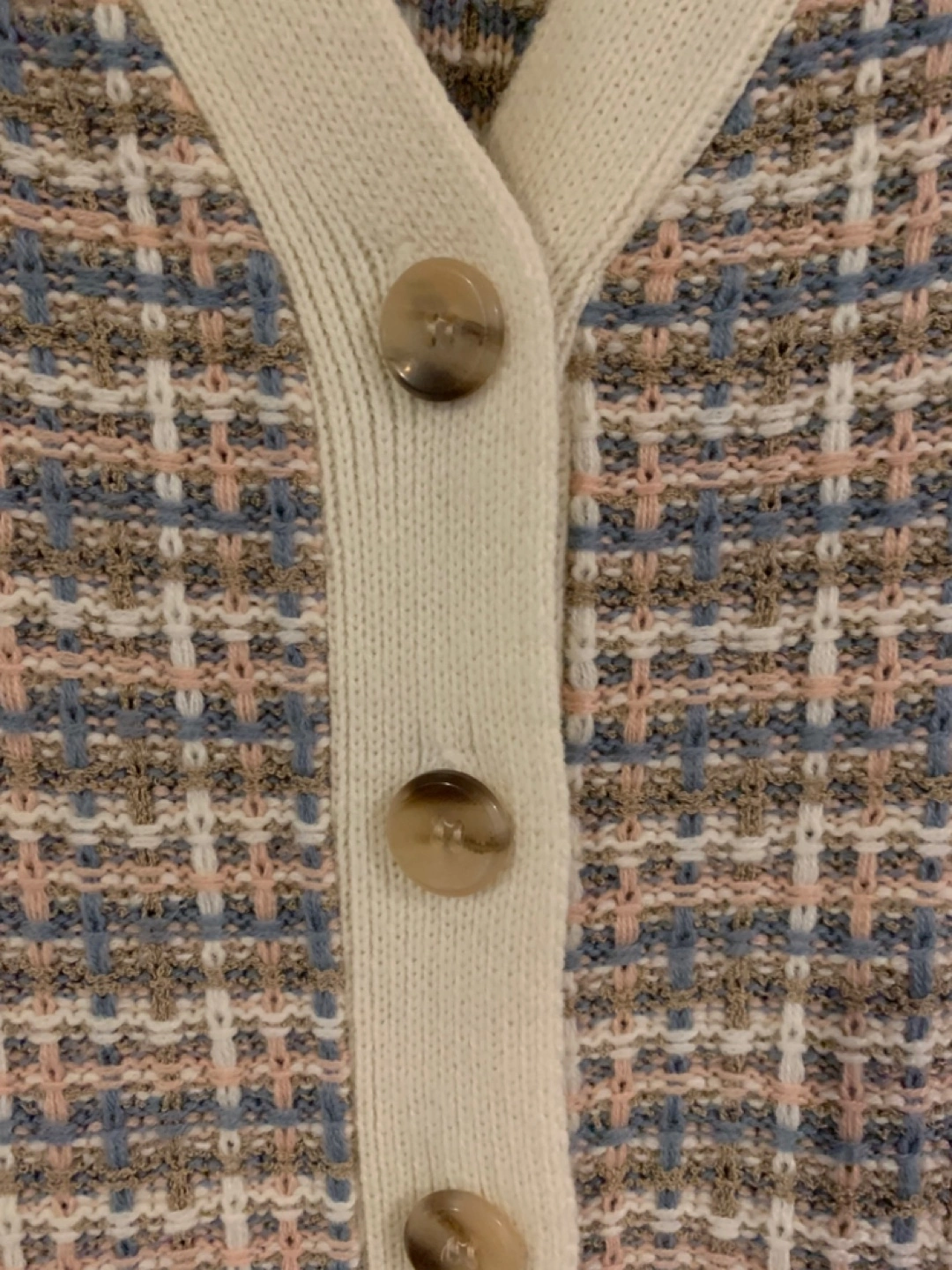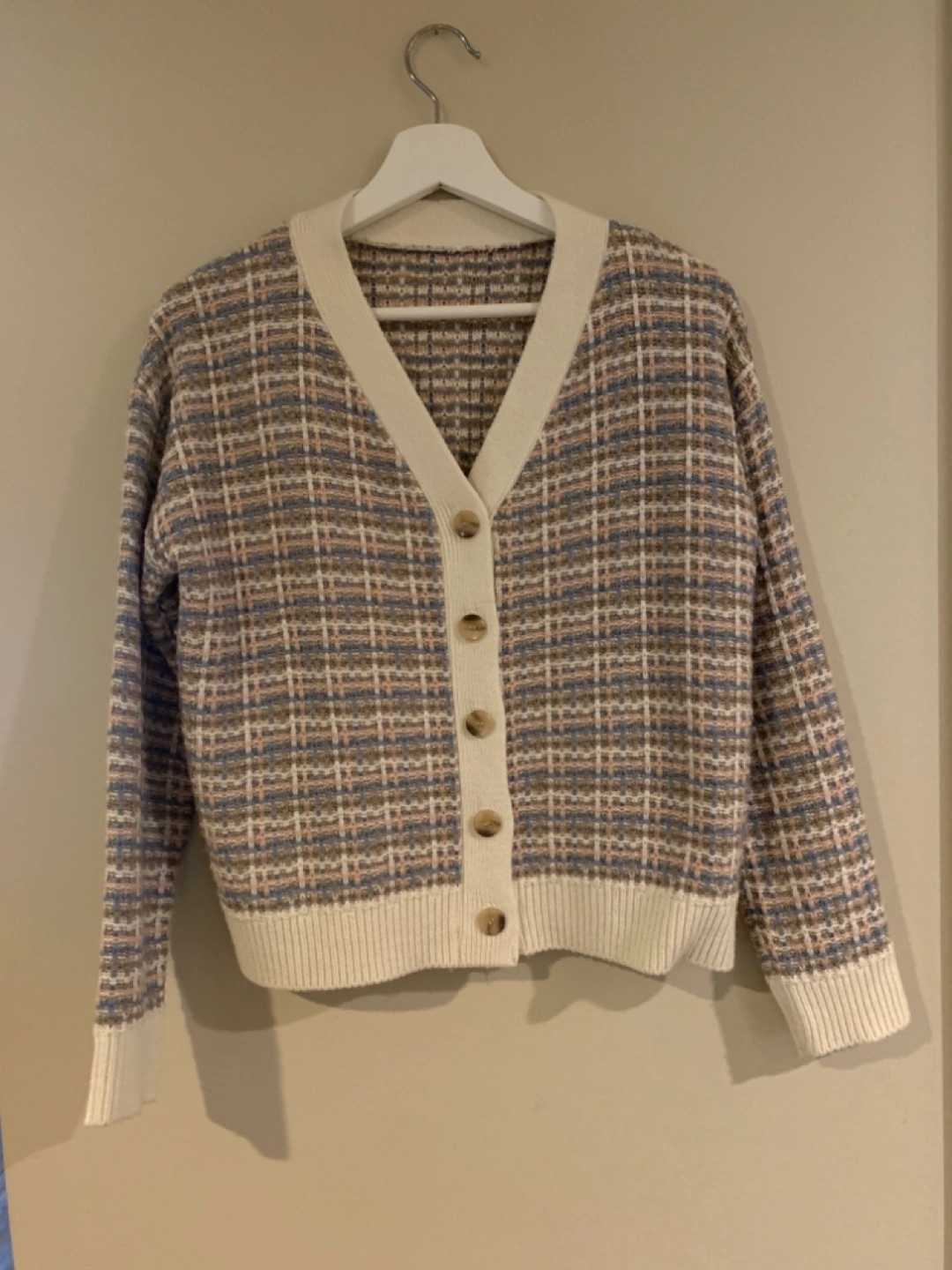 Here's a cute patterned knit cardigan! It features a v-neck and button-up design. Perfect for layering or wearing on its own during cooler days