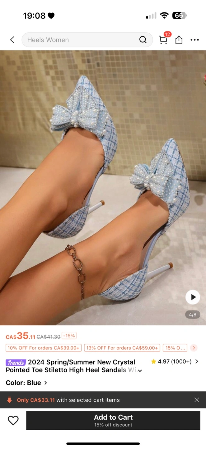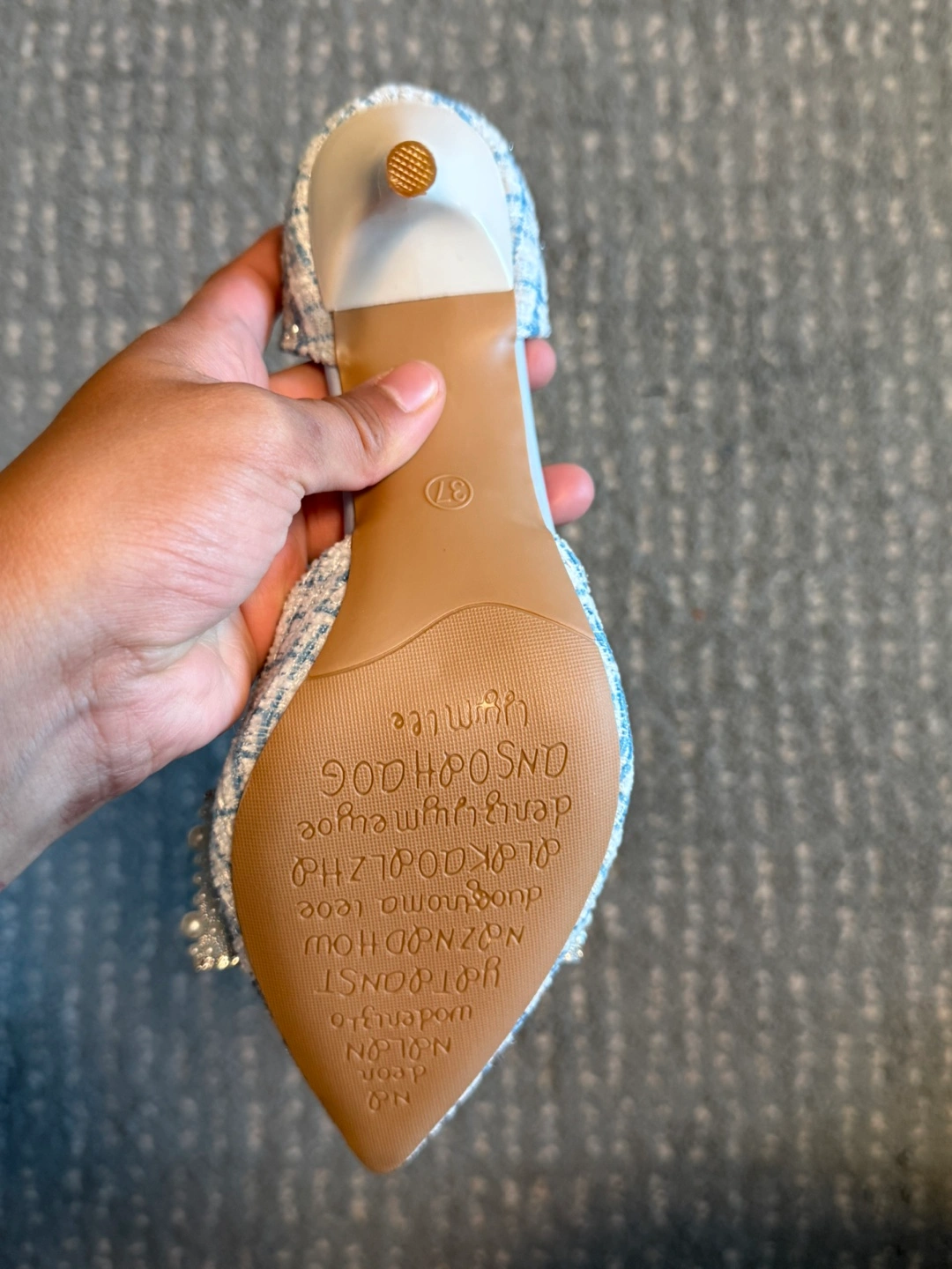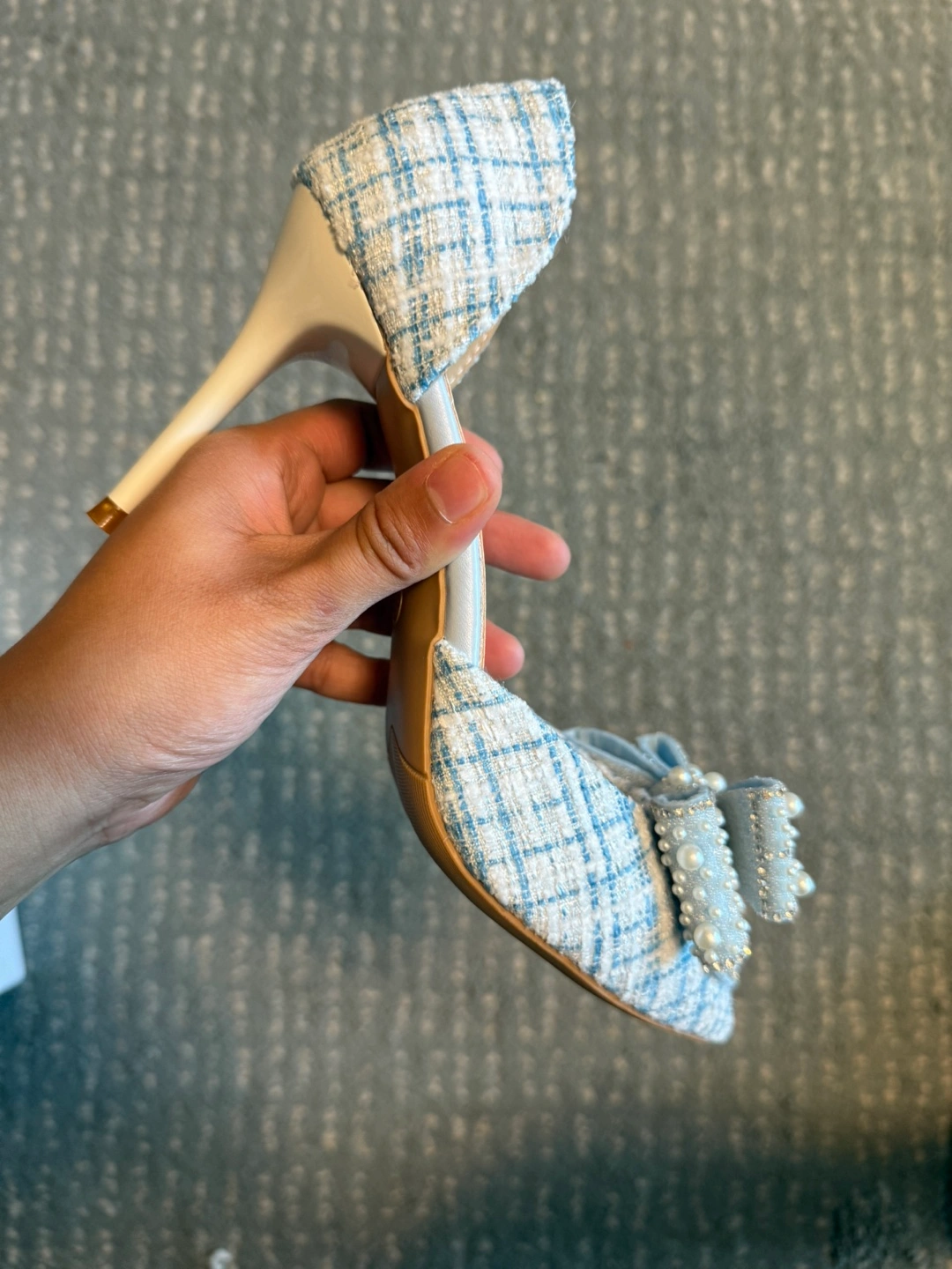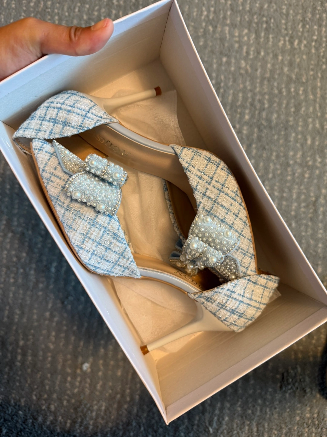 Selling a pair of 2024 spring/summer crystal pointed toe stiletto high heel sandals. They're a beautiful blue colour and come with a cute bow detail. Comes with the box!