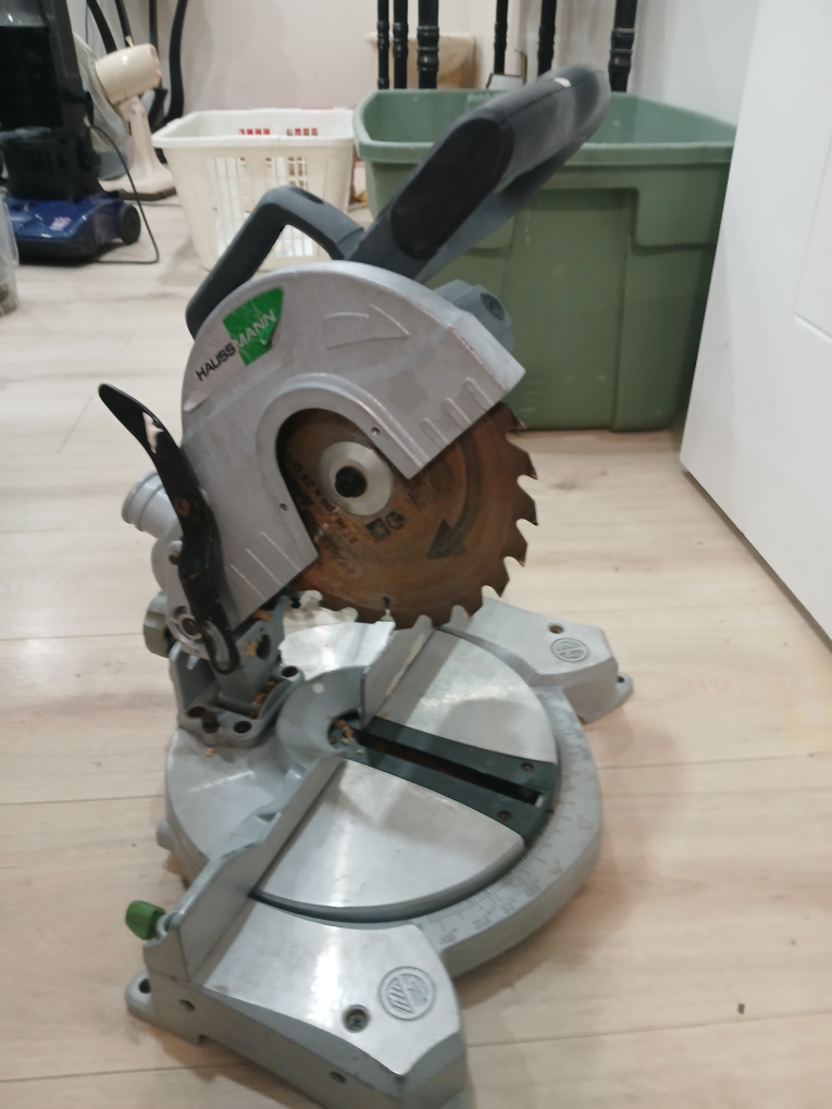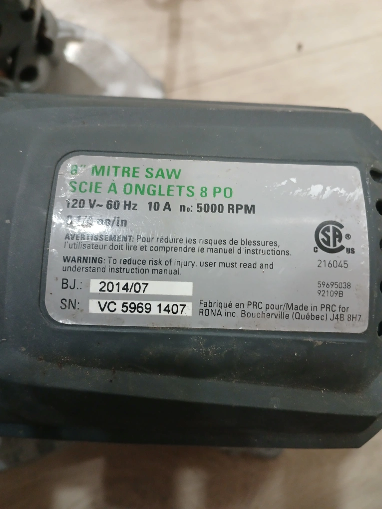 Selling a Haussmann 8" mitre saw. It operates at 120 V - 60 Hz, 10 A, and 5000 RPM. Please read and understand the instruction manual before use