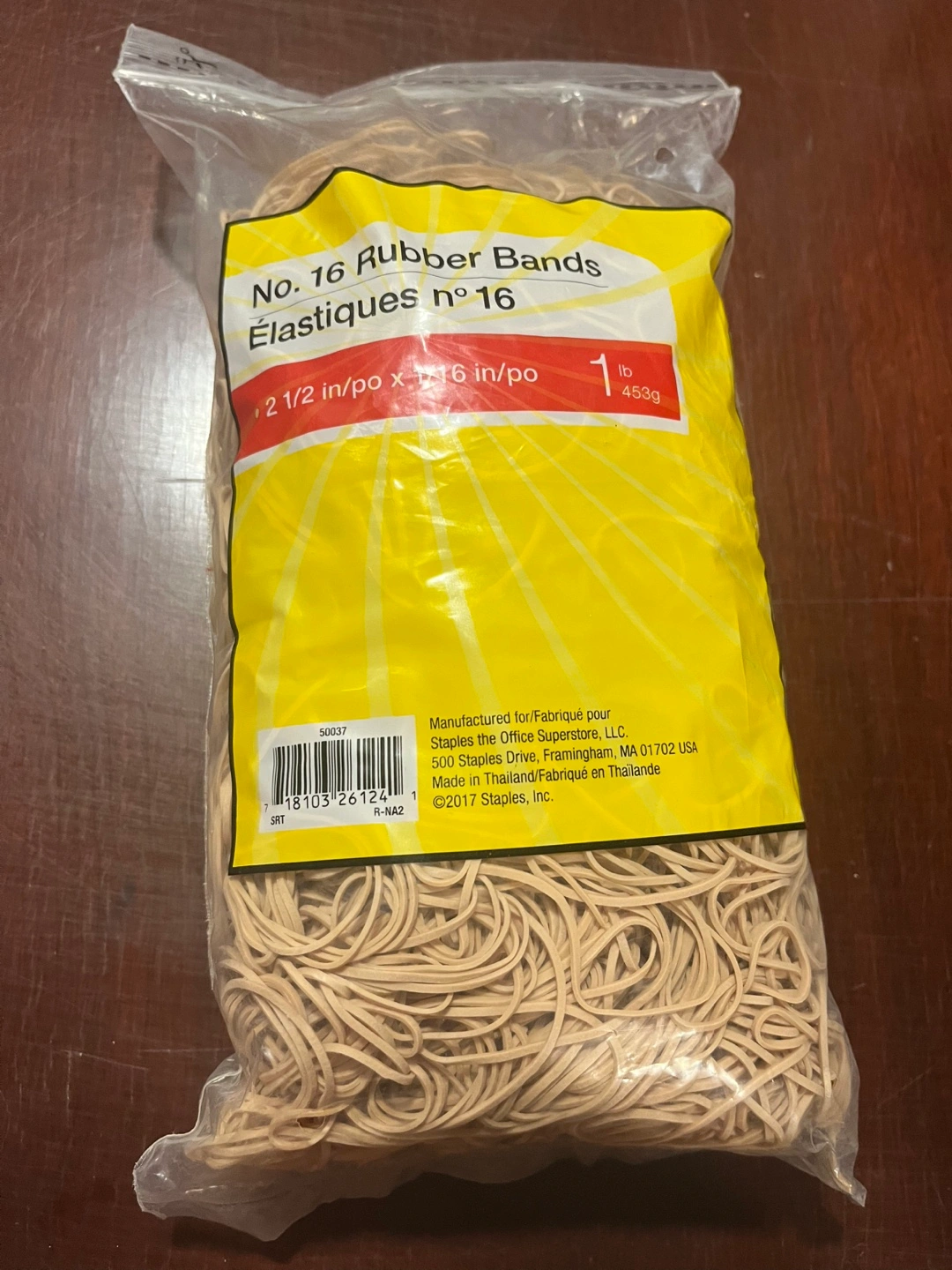 Selling a bag of Staples No. 16 Rubber Bands. The bag contains 1 lb (453g) of rubber bands, each measuring 2 1/2 in/po x 1/16 in/po. Perfect for office or home use!